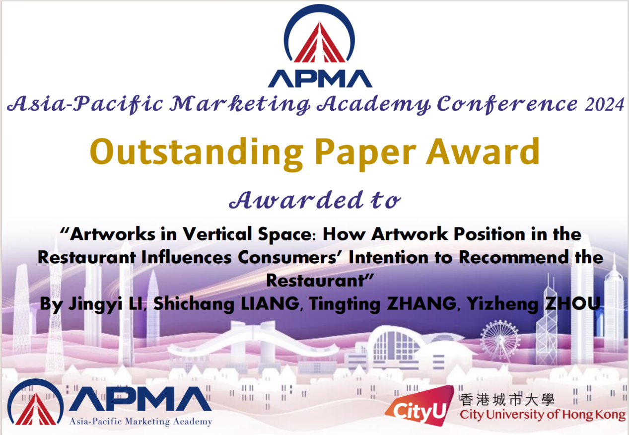 梁世昌副教授指导的2022级硕士研究生李静益、张婷婷的论文《垂直空间中的艺术品:餐厅中艺术品的位置如何影响消费者推荐餐厅的意向》(Artworks in Vertical Space: How Artwork Position in the Restaurant Influences Consumers' Intention to Recommend the Restaurant)获杰出论文奖。李静益、张婷婷作为研究生代表参加了会议。