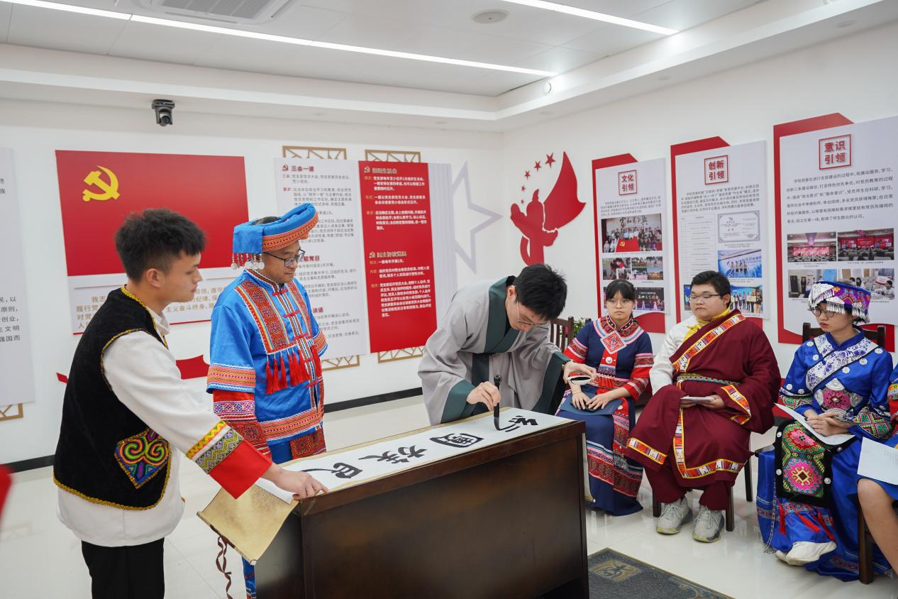 座谈会上,来自仫佬族的梁江雨同学、吴静妃同学,纳西族的万人杰同学、傣族的杨锦辉同学、苗族的何怡雪同学和维吾尔族的凯丽比努尔同学结合自身在少数民族预科班、民族班的求学经历,讲述了各民族学生之间交往交流交融的故事,言谈中不时流露出对党和国家加快培养少数民族地区人才特殊政策措施的感恩之情;来自汉族的梁耀升同学、彭薇雨同学分享了发生在身边的民族团结一家亲、和谐发展心连心的故事,让大家深刻体会到了中华民族一家亲、同心共筑中国梦的时代意义。在聊思想、谈感受的同时,梁江雨同学和吴静妃同学跟大家分享了仫佬族的服饰风俗,饮食风俗,居住风俗等,让大家记住了精致独特的仫佬族服饰和文化;杨焜同学从苗族地理分布、文化习俗、苗族跳坡节进行分享,并唱起山歌抒发了对党的感激之情!凯丽比努尔同学详细跟老师同学们讲解了维吾尔族名字的由来,分享了维吾尔族的节日盛况,并现场跳起新疆舞……各族学生代表畅所欲言,畅谈了自己来到大学适应地区气候、融入大学生活的情况和对未来的设想规划等,并结合自身体会,讲述了在党的民族政策下,感受到的党和国家对少数民族学生的关心与关爱。