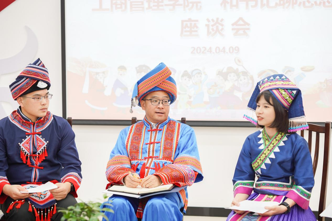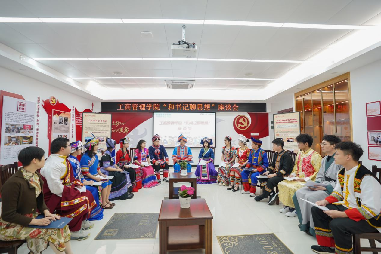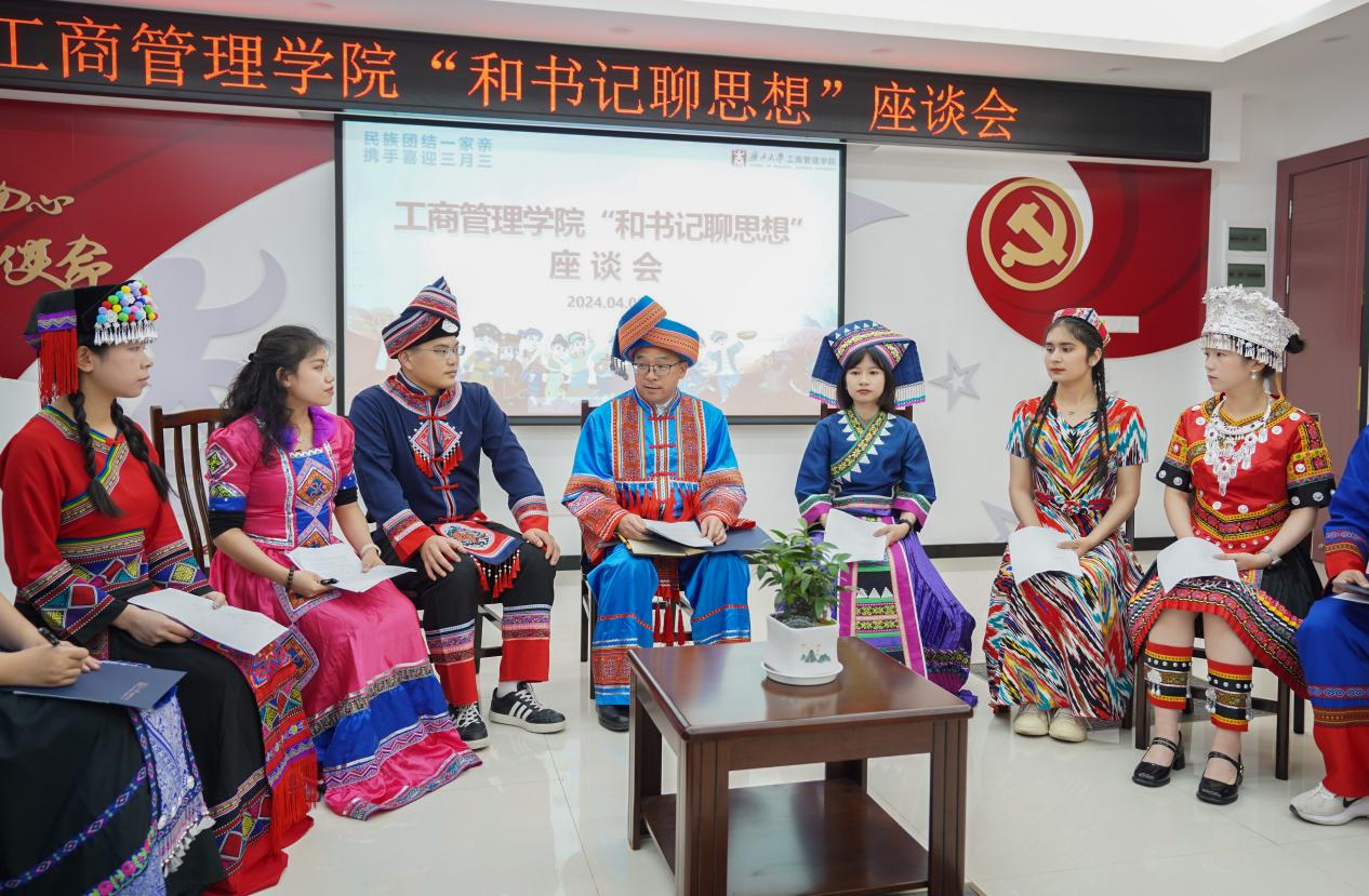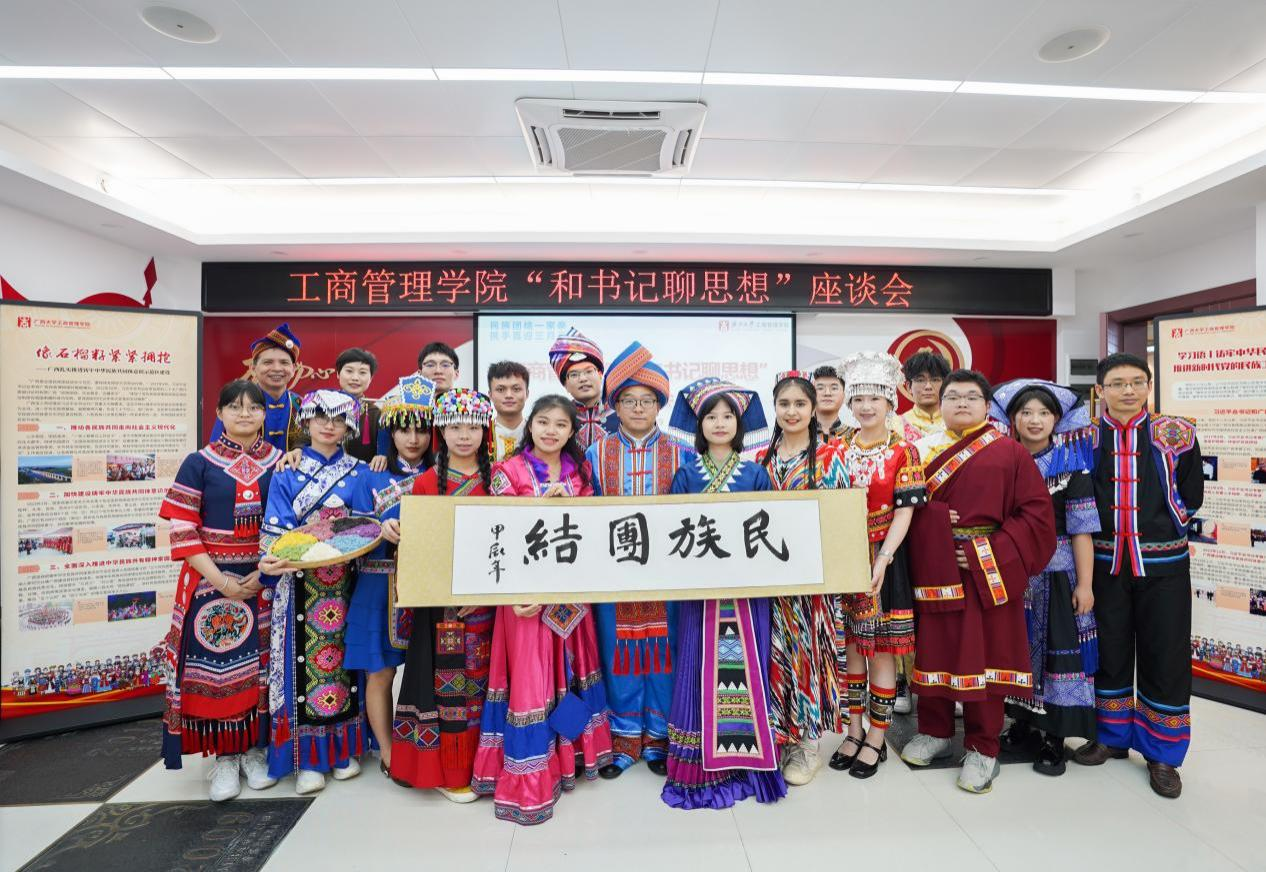 在党员活动室举行各族学生代表“和书记聊思想”座谈会,学院党委书记罗诚身着民族服装与壮族、汉族、仫佬族、苗族、瑶族、维吾尔族、纳西族、傣族、满族等14名各族学生代表欢聚一堂,共庆佳节。学院党委副书记肖克宁,团委书记马丽娟、组织员黄照温、辅导员郁文丹参与座谈。