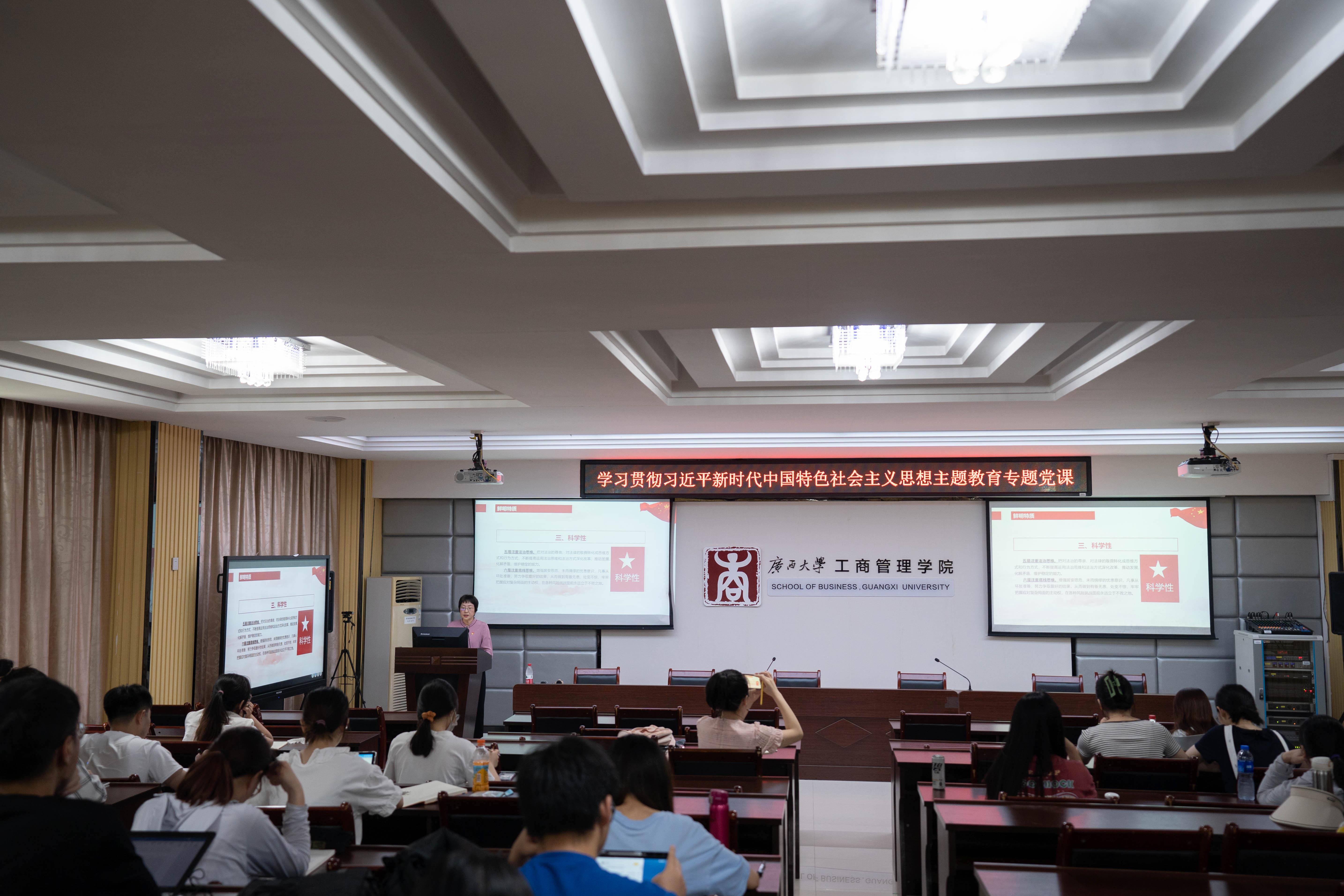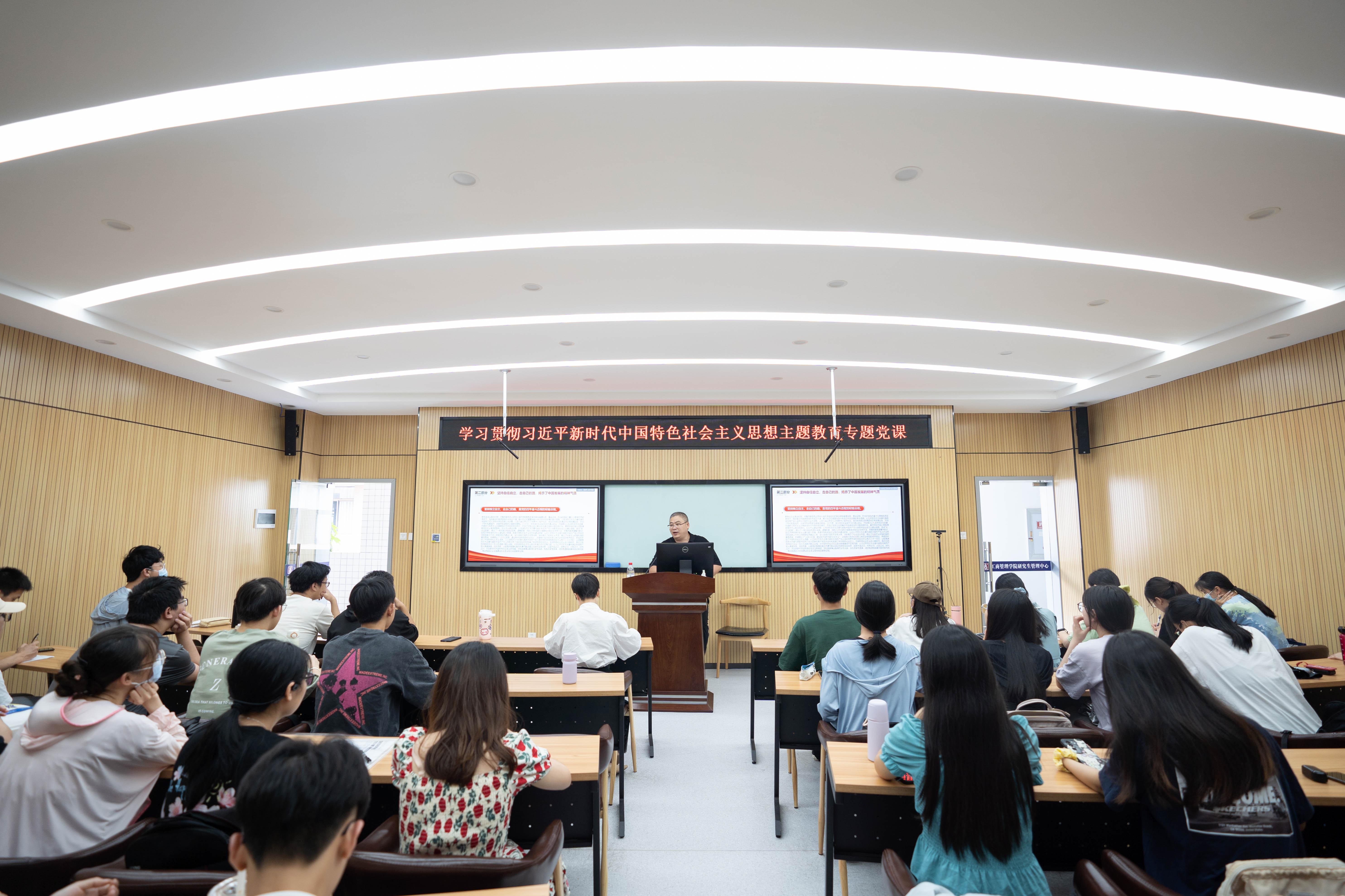 学院副院长廖东红以《学习贯彻习近平新时代中国特色社会主义思想》为题,在学院124报告厅为研究生第一党支部和本科生第四党支部讲授专题党课,她就习近平新时代中国特色社会主义思想主题教育概述、主要内容以及鲜明特质进行了阐述。她号召大家以主题教育为契机,深入学习贯彻党的二十大精神,努力把学院建成“区域有品牌,国内有特色,国际有影响”的新时代高水平av片