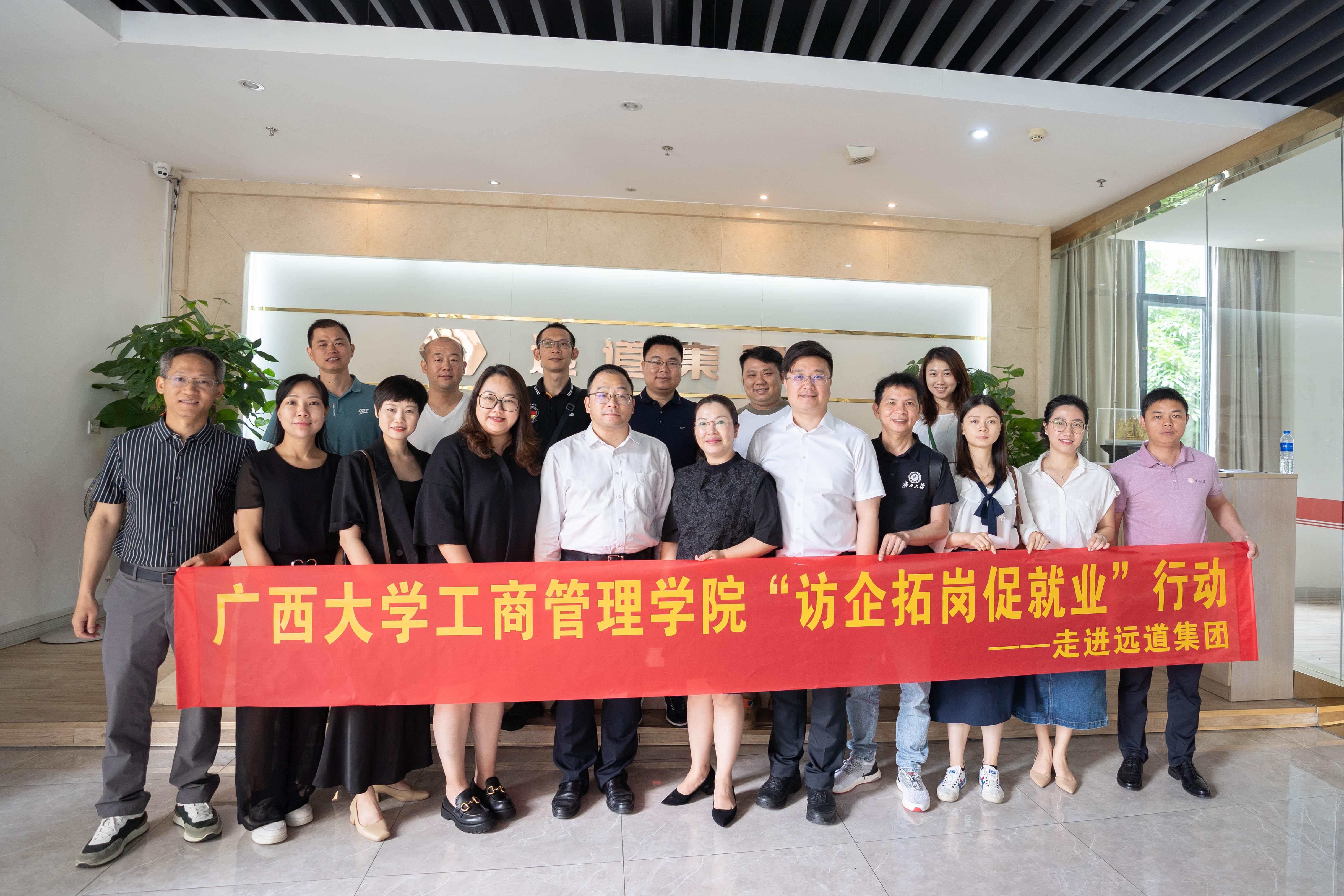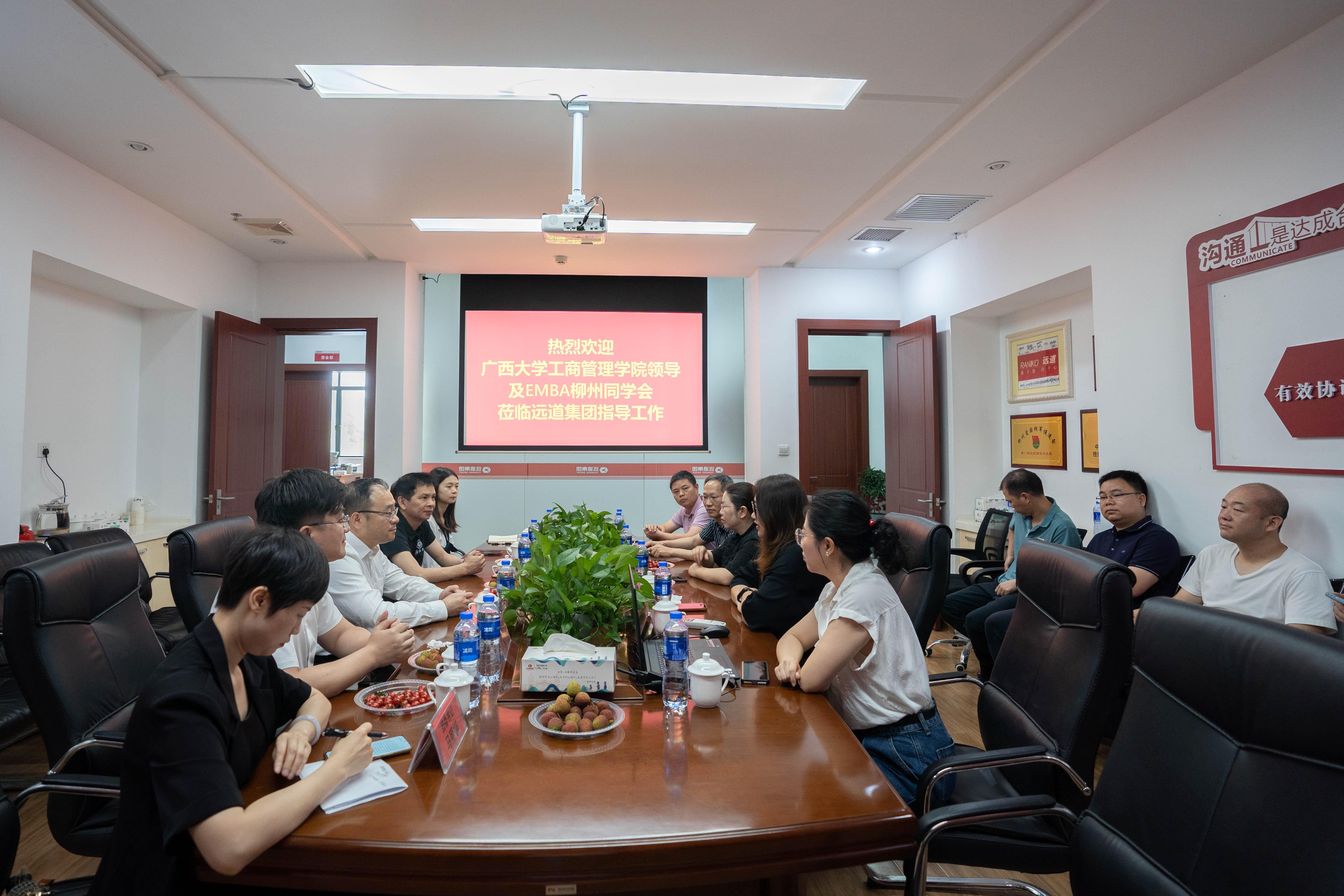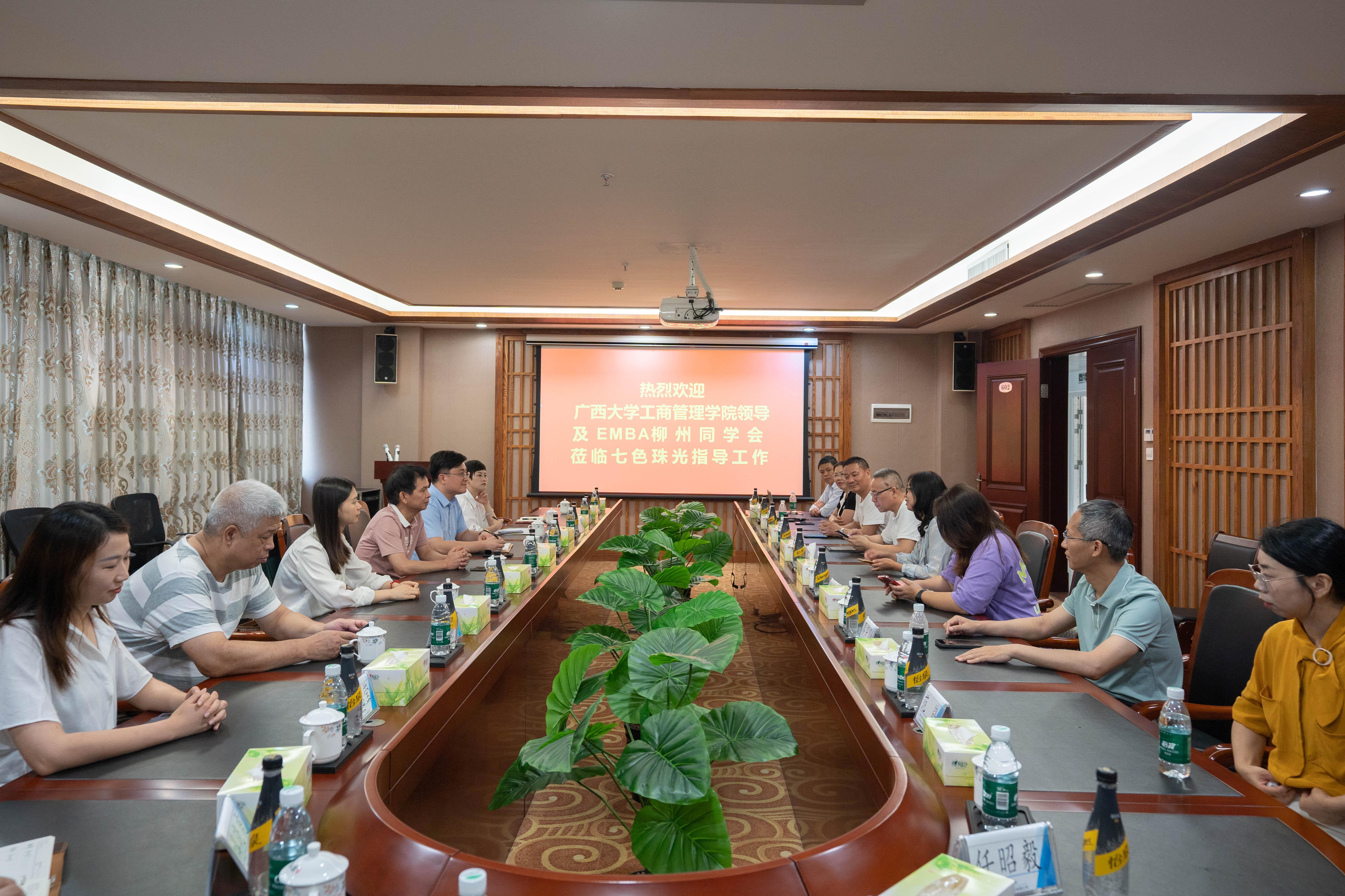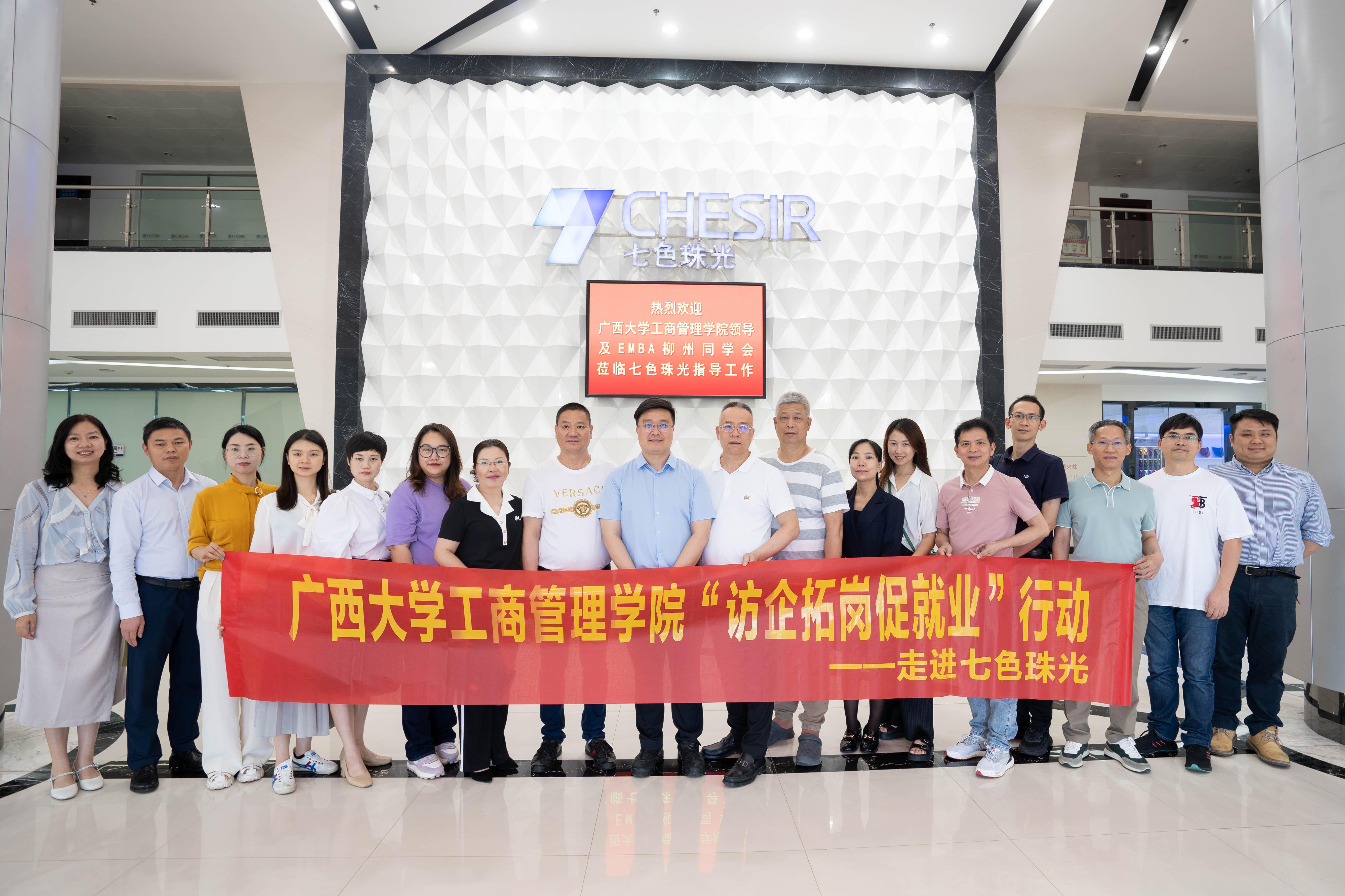 为深入开展学习贯彻习近平新时代中国特色社会主义思想主题教育,全面深化院企合作,落实高校毕业生就业工作“一把手”工程,5月19日至20日,学院党委书记罗诚、党委副书记黄晋、副院长朱少英带队到柳州校友企业广西七色珠光材料股份有限公司(以下简称为“七色珠光”)、广西远道投资集团调研(以下简称为“远道投资”),开展“访企拓岗促服务”专项行动,团委书记马丽娟、组织员黄照温等相关老师,以及EMBA柳州校友会部分代表参加此次活动。