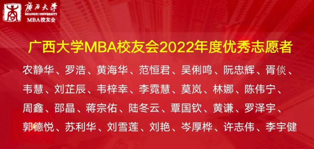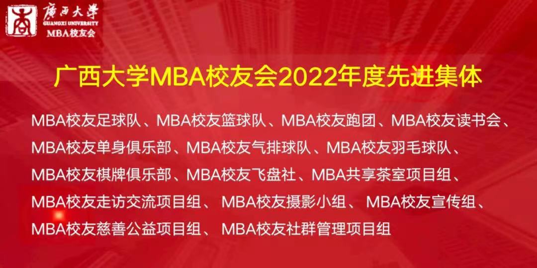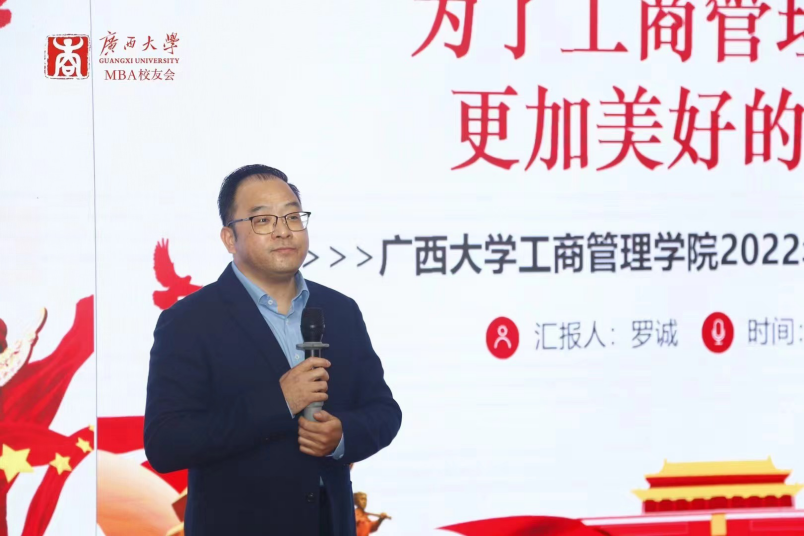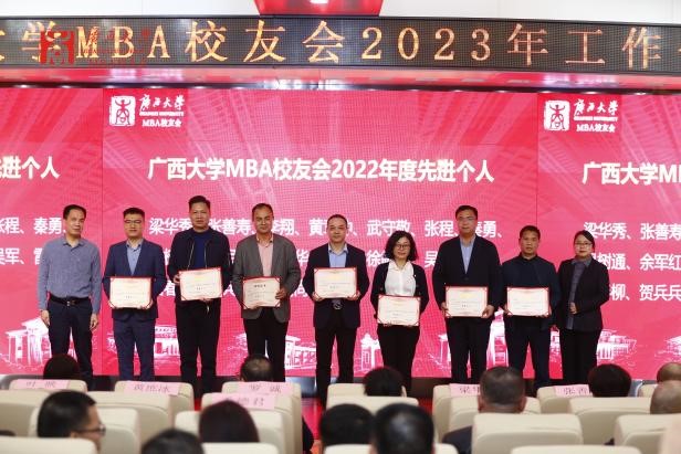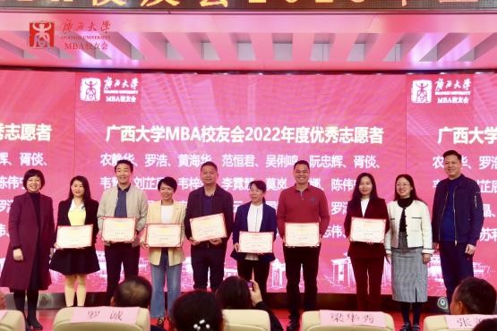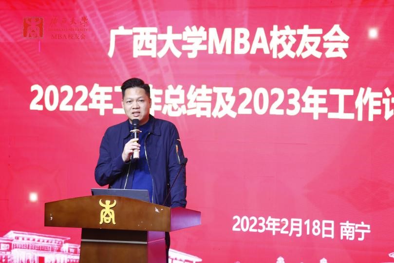 MBA校友会会长梁华秀作2022年工作总结,他表示,MBA校友会团队是“广西学历最高的志愿者服务团队”。校友会在2022年开展了系列丰富多彩的活动,包括各类走访交流活动、MBA校友沙龙、MBA校友共享茶室公益平台、MBA校友读书会、慈善公益活动以及形式多样的文体活动等。
