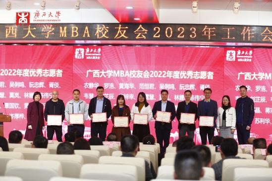 MBA校友会新聘任周树高、吴俐鸣、黄谦、阮忠辉、凌玲、黄海华、刘雪莲、李琼、农静华、罗浩、胥倓等11位校友为MBA校友会副秘书长,并为他们颁发了聘书。