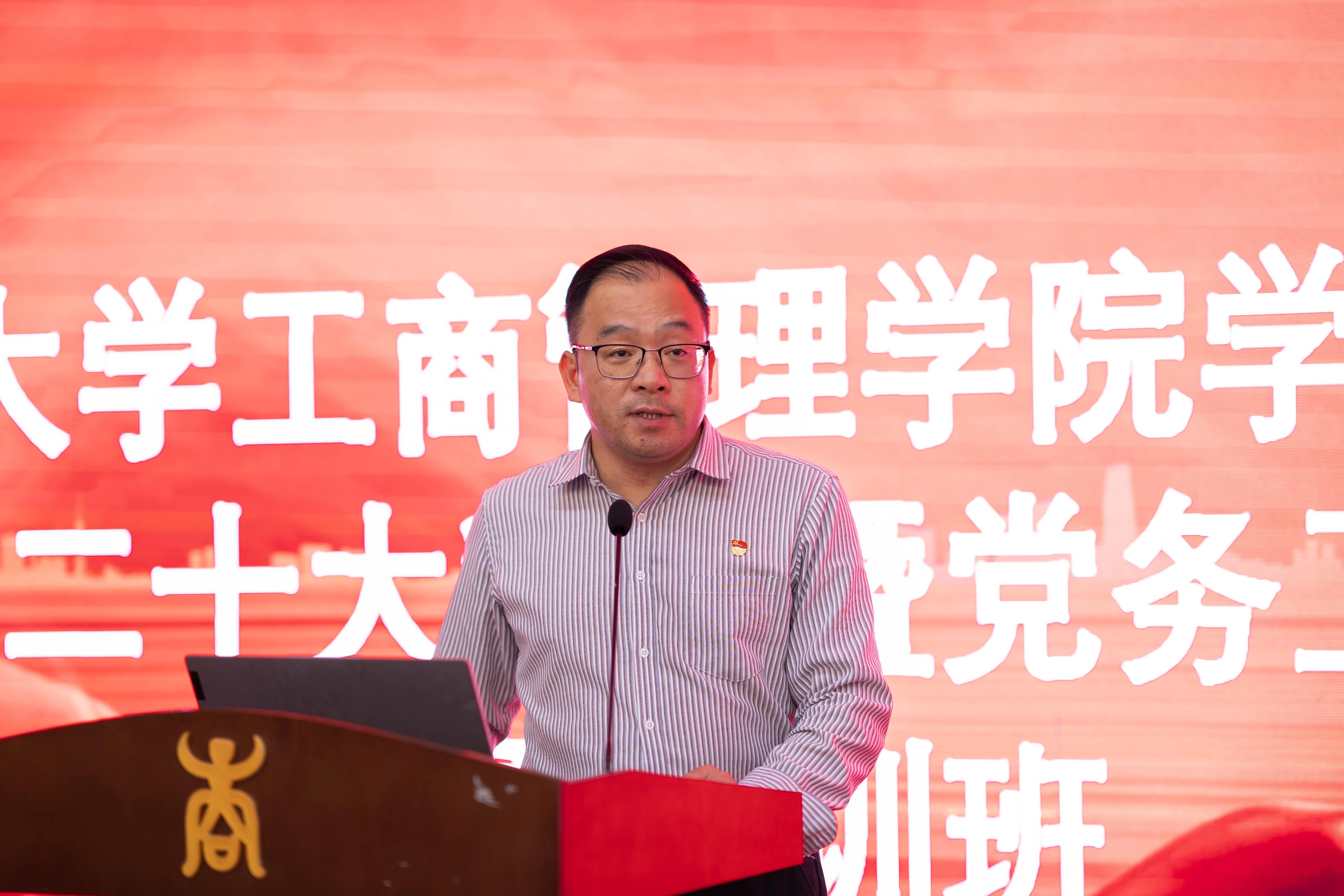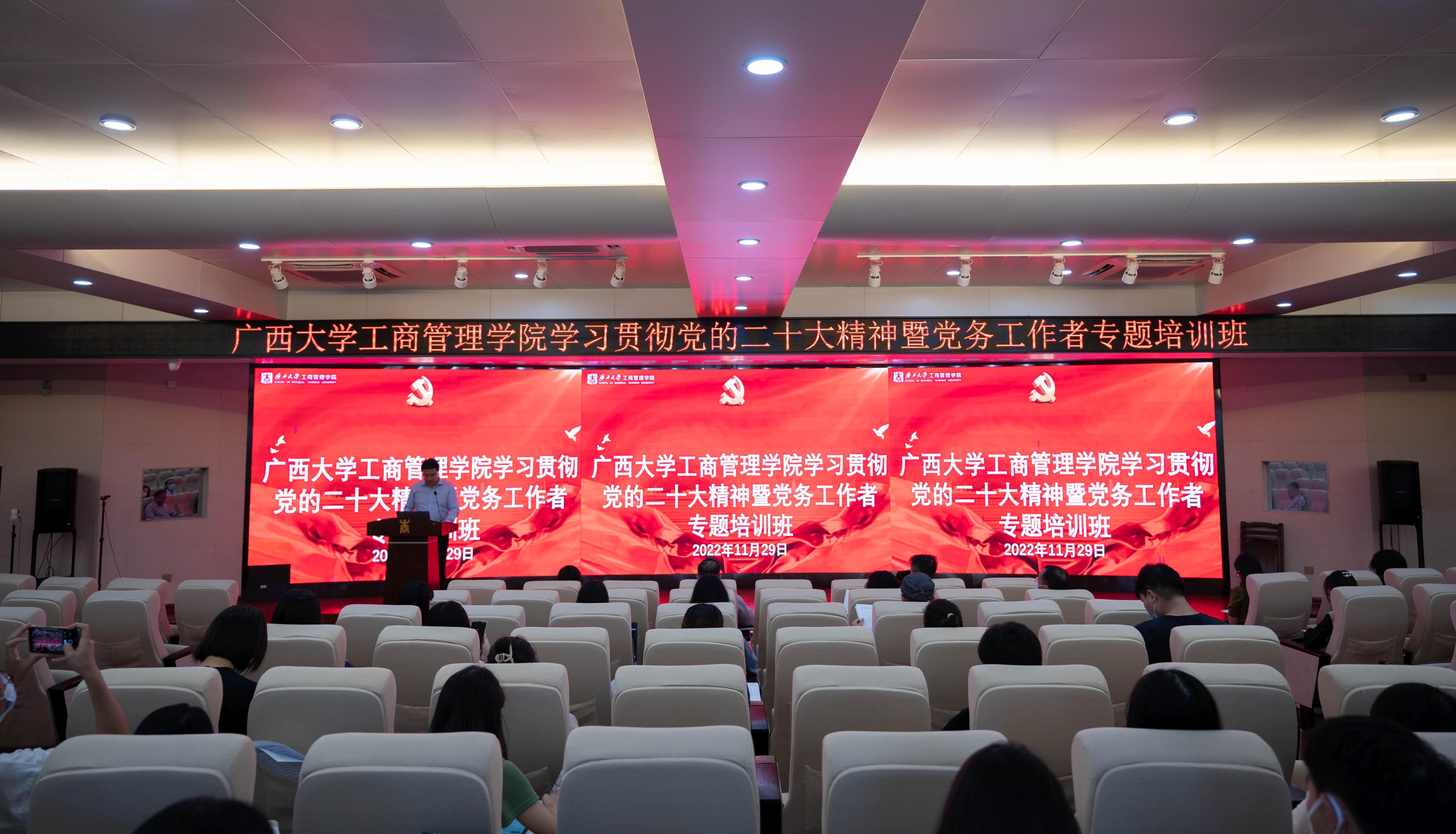 深入学习宣传贯彻党的二十大精神宣讲报告会暨党务工作者培训班开班式在学院128报告厅举行。学校党委宣传部副部长覃安基受邀出席并作意识形态专题辅导报告。学院党委书记罗诚出席开班式并作动员讲话,党委副书记黄晋主持开班式。全院党务工作者、有关党员干部和师生参加了培训。