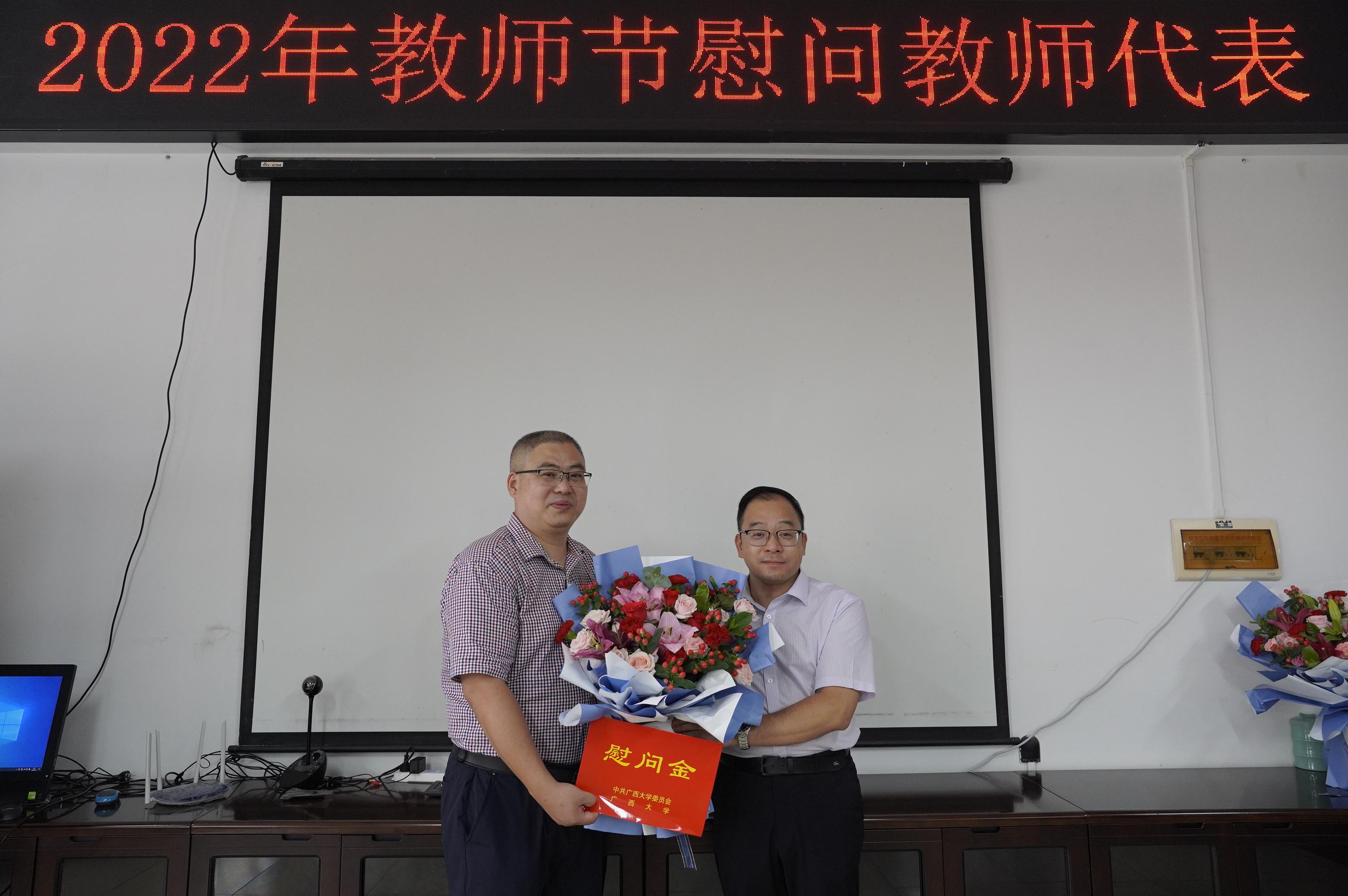 慰问活动中,罗诚书记代表学院党委向三位教师代表致以节日的祝福和亲切的慰问,并通过他们向辛勤耕耘、默默奉献在各自工作岗位上的全院教职工致以节日的问候和崇高的敬意!感谢大家在过去的日子里对学院的发展所付出的辛苦和做出的贡献!罗书记指出,今年教师节的主题是“迎接党的二十大,培根铸魂育新人”。他号召全院教职工共同努力,在全面建设社会主义现代化国家新征程中勇担培育时代新人的历史使命,以昂扬向上的精神面貌和立德树人的扎实行动,迎接党的二十大胜利召开!