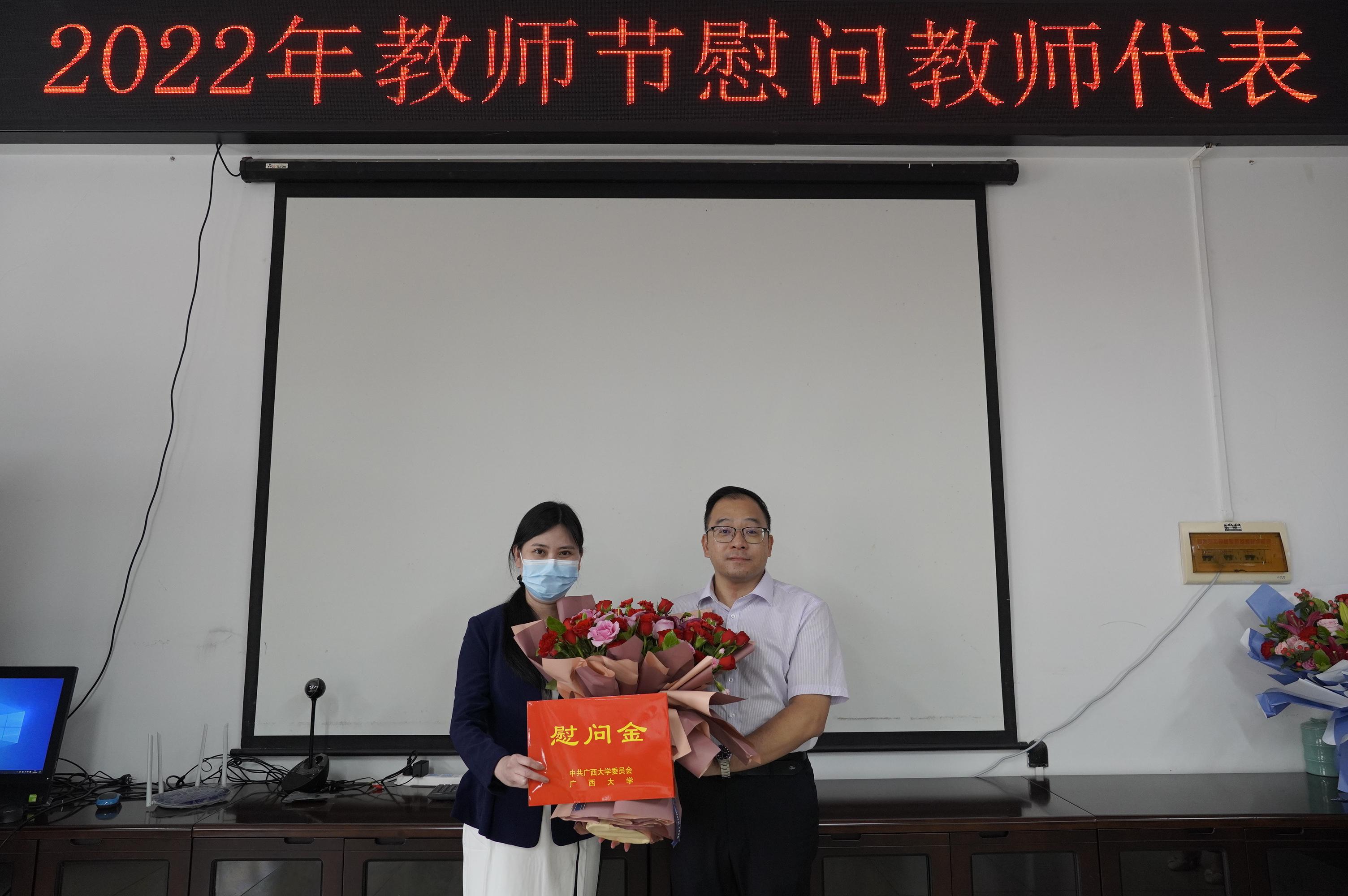 党委书记罗诚受学校委托慰问朱帮助、黎鹏、韦荷琳三位老师,为他们送上了鲜花、节日祝福和慰问金,传达学校对广大教职员工的关心厚爱。接受慰问的三位教师代表对学校的关心表示衷心感谢,表示会潜心教育,积极科研,奋勇争先做好本职工作,为学院、学校事业发展添砖加瓦、增光添彩。