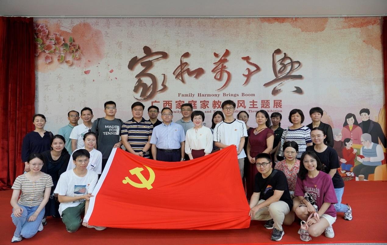 随后,全体党员同志来到“家和万事兴——广西家庭家教家风主题展”展厅,先后参观学习了“红色家风”“先贤家教”“清廉家庭”三个板块的内容。该展厅介绍传统优秀家风家训、与优良家风有关的人物故事,革命先辈的家风文化以及当代杰出代表的家风故事,集中展示了党的十八大以来深入贯彻落实习近平总书记的重要指示精神,在家庭家教家风建设方面所取得的成效,如毛泽东同志“教子严、律己严、持家严”的严格家风,习近平总书记以家风涵养初心使命的红色家风,黄大年、黄文秀、梁小霞等八桂大地上的先进典型家庭故事,内容丰富、故事生动。党员同志们纷纷表示,本次主题党日活动学习中国共产党员的优良家风家训,有力地激发了心底的道德情感,引导党员们自觉践行社会主义核心价值观,强化廉洁齐家、乐于奉献的精神。