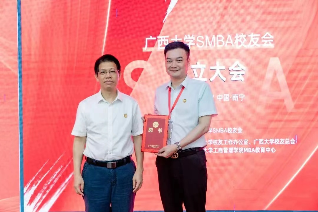 党委常委、总会计师、校友总会常务副会长宁旭初(左)为SMBA校友会会长莫兴锋颁发聘书