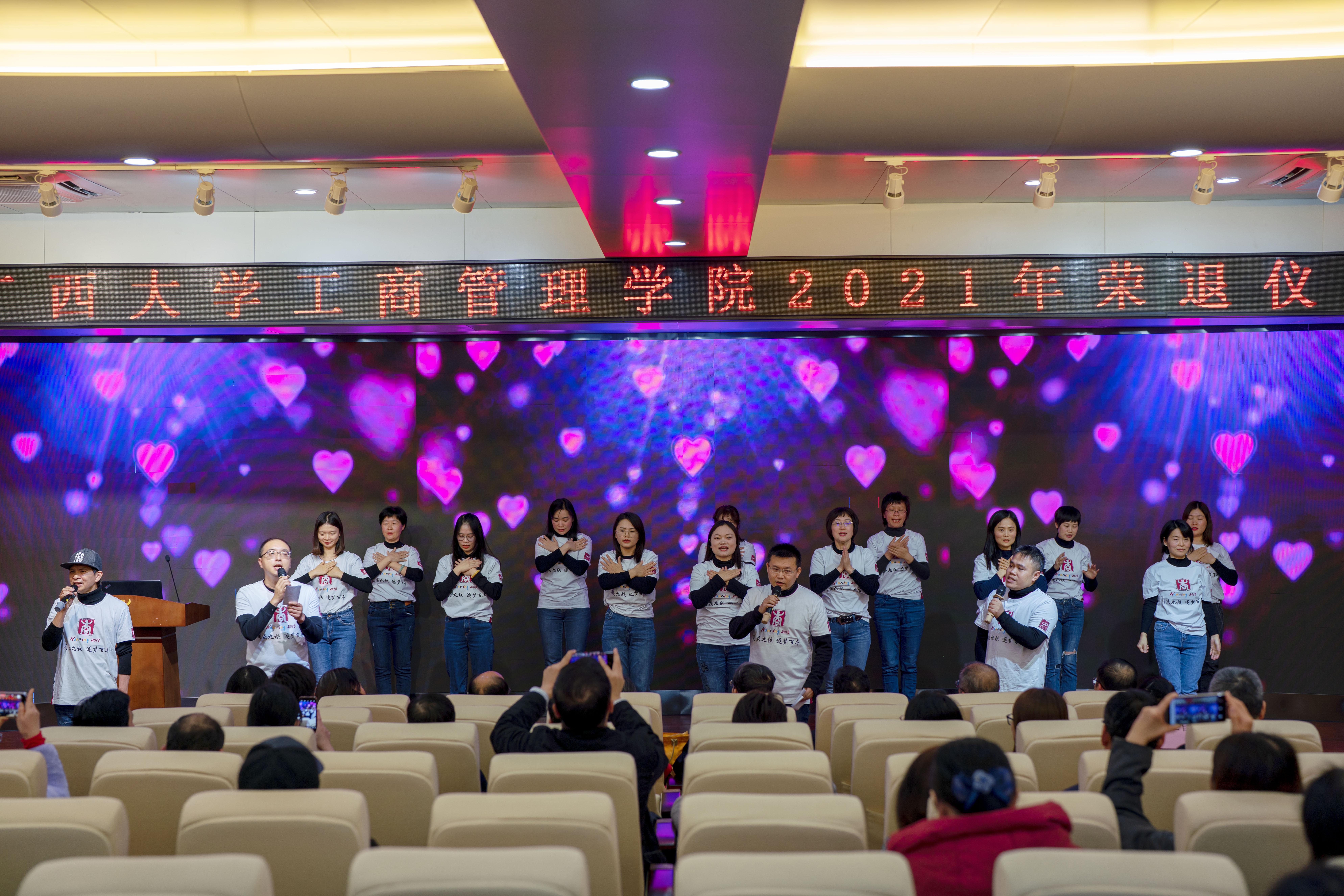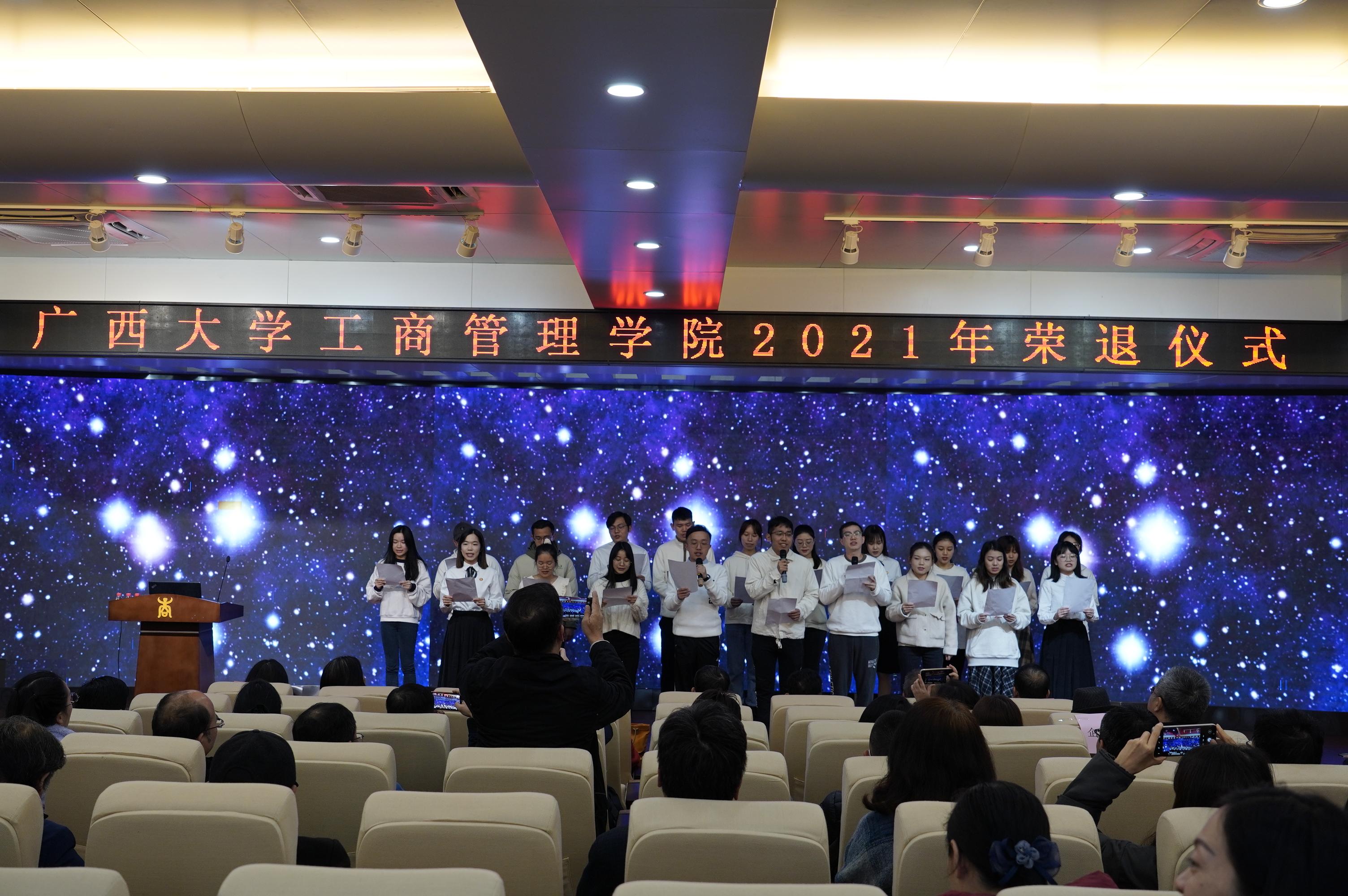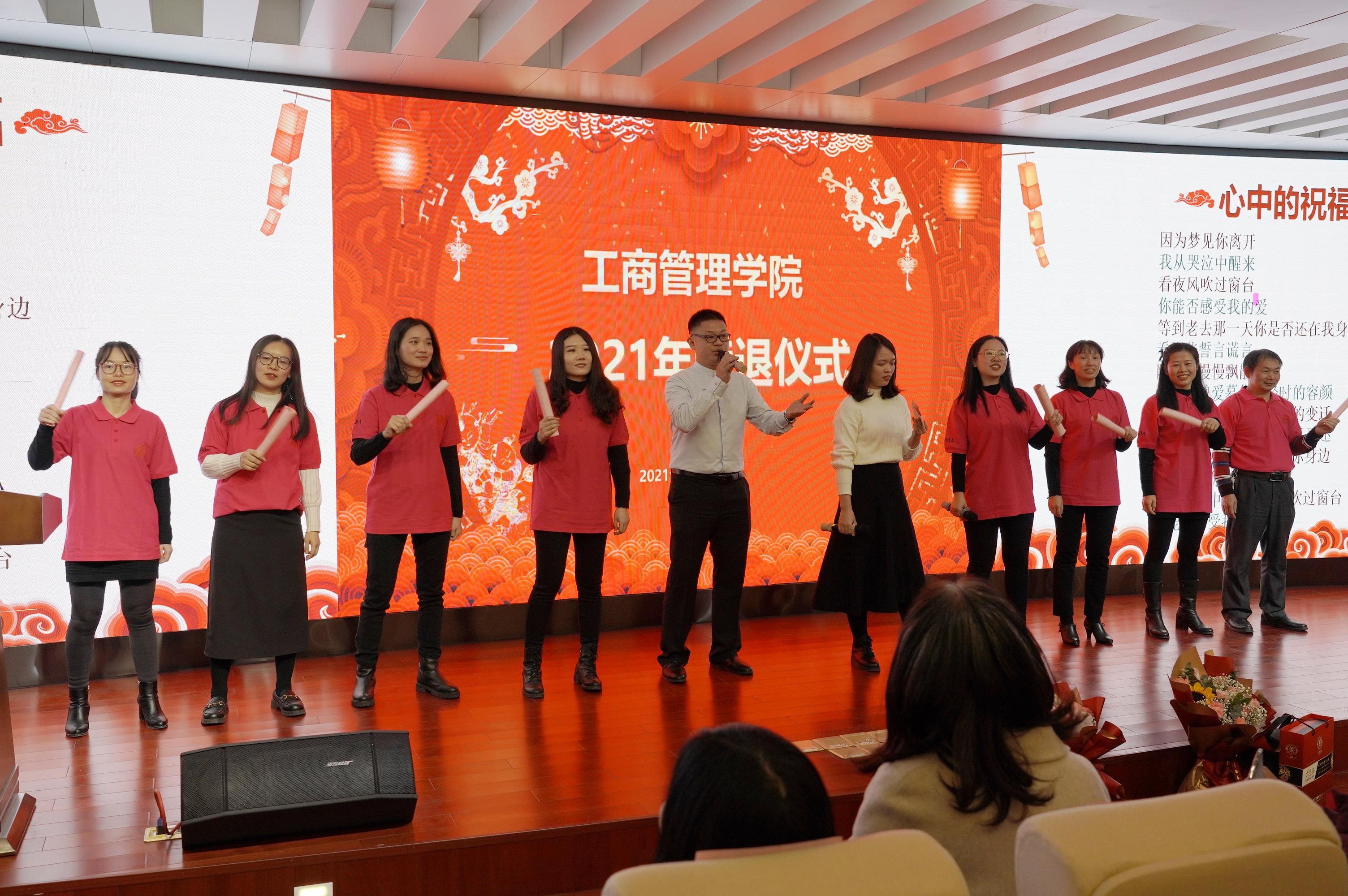 荣退仪式上,为更好地分享和宣传荣退教师的优秀事迹,学院精心策划、制作了专访视频,在仪式现场邀请共事多年的老师们讲述退休老教师的趣闻逸事,还穿插了由老师和同学们表演的歌舞、诗朗诵,全场洋溢着温暖又欢乐的气氛。