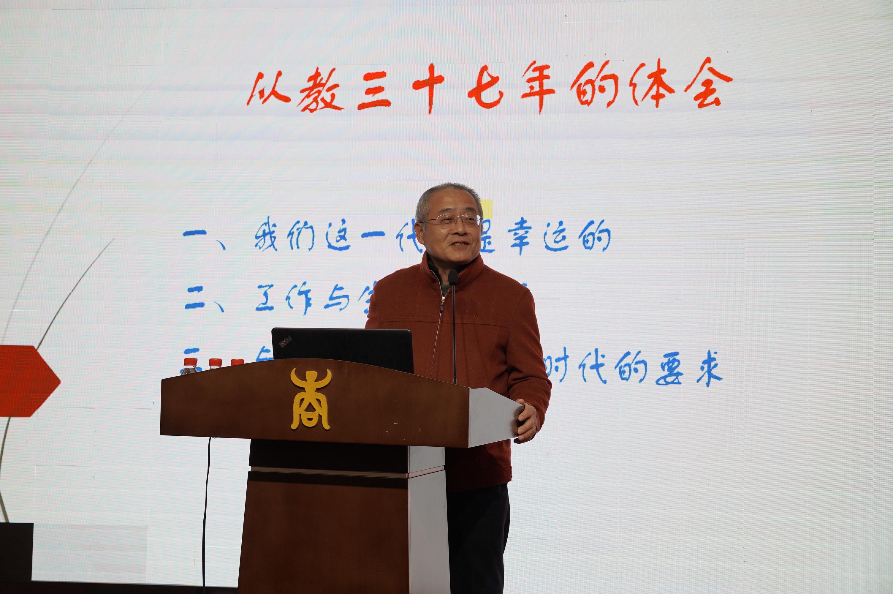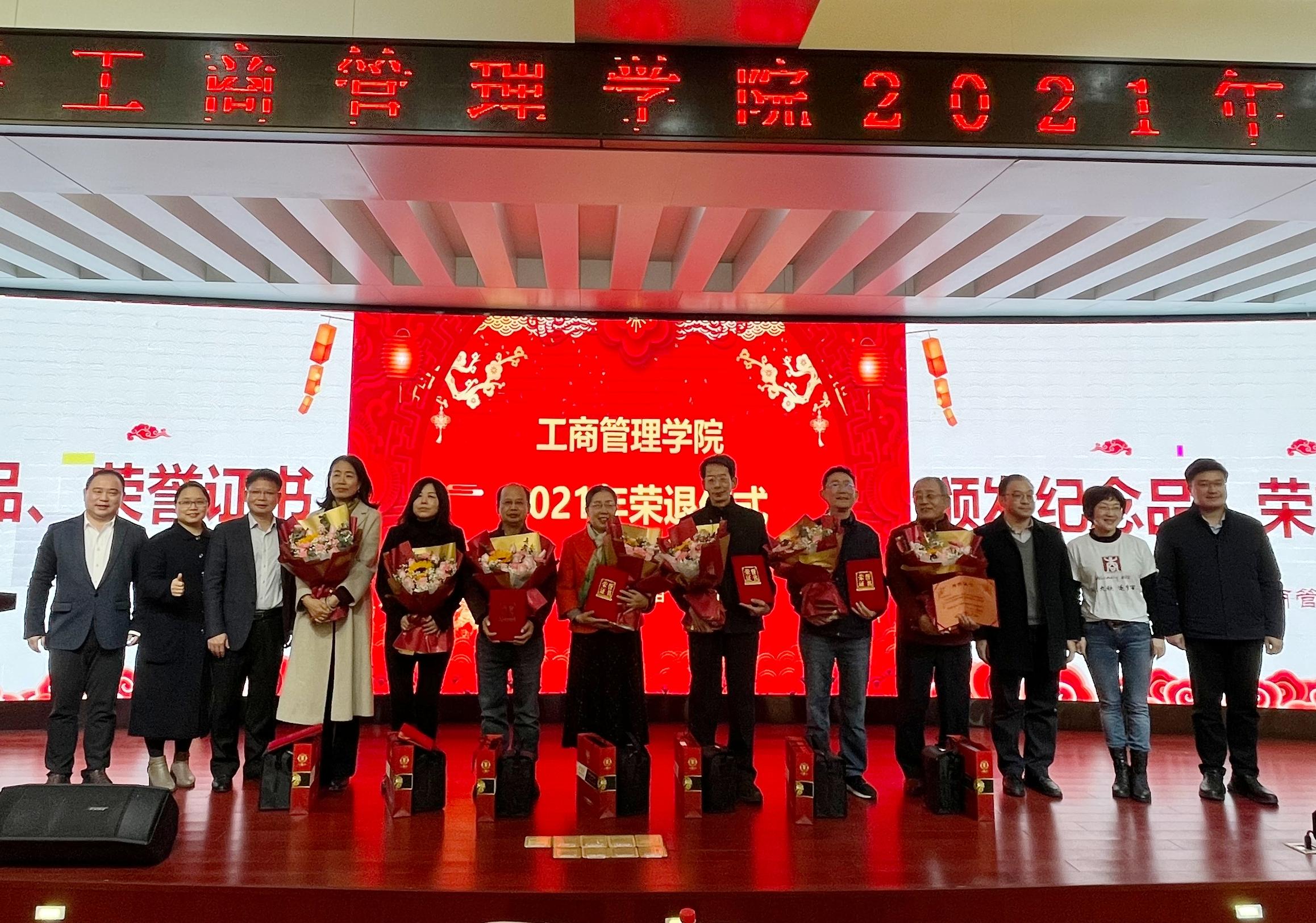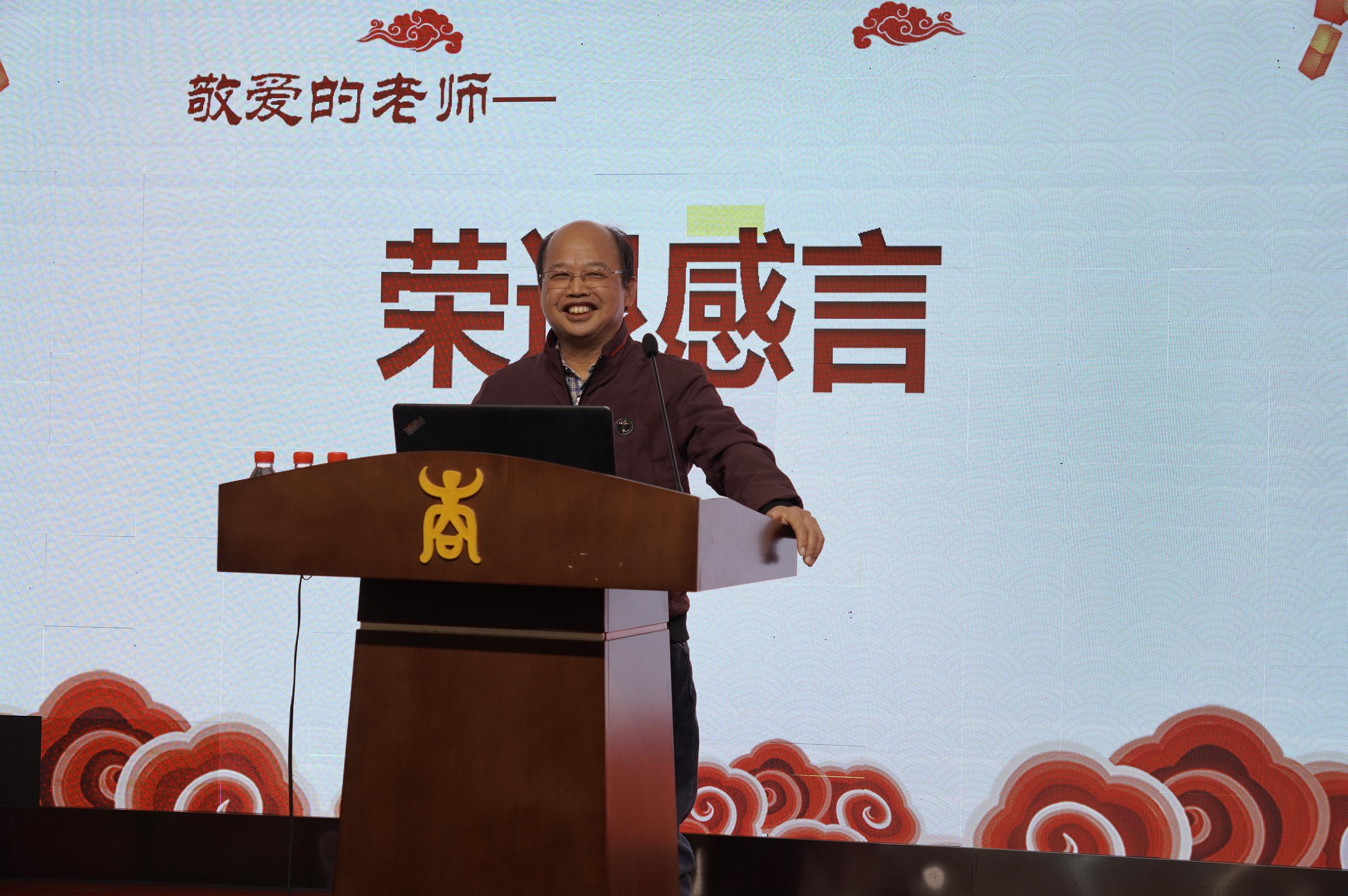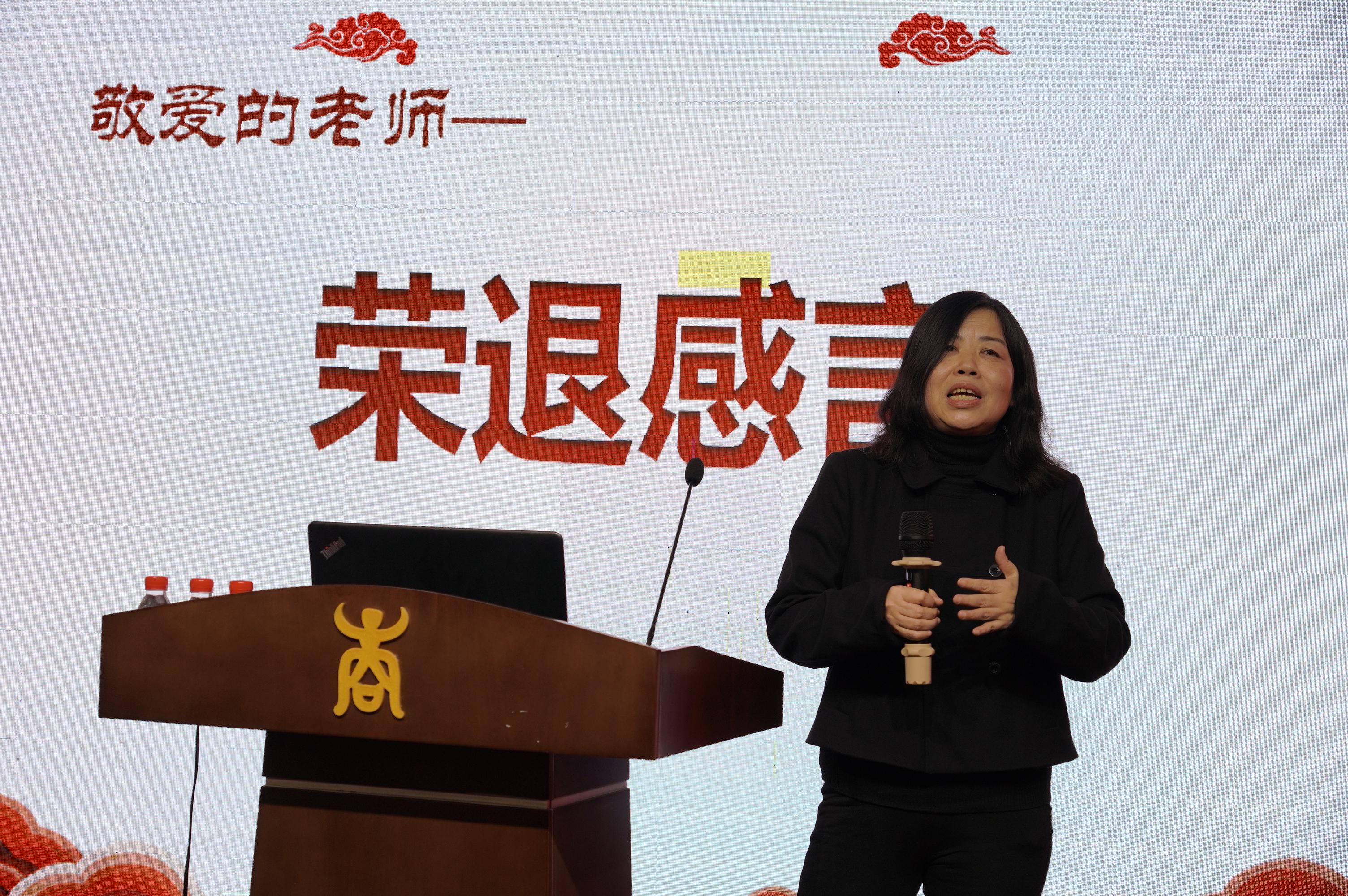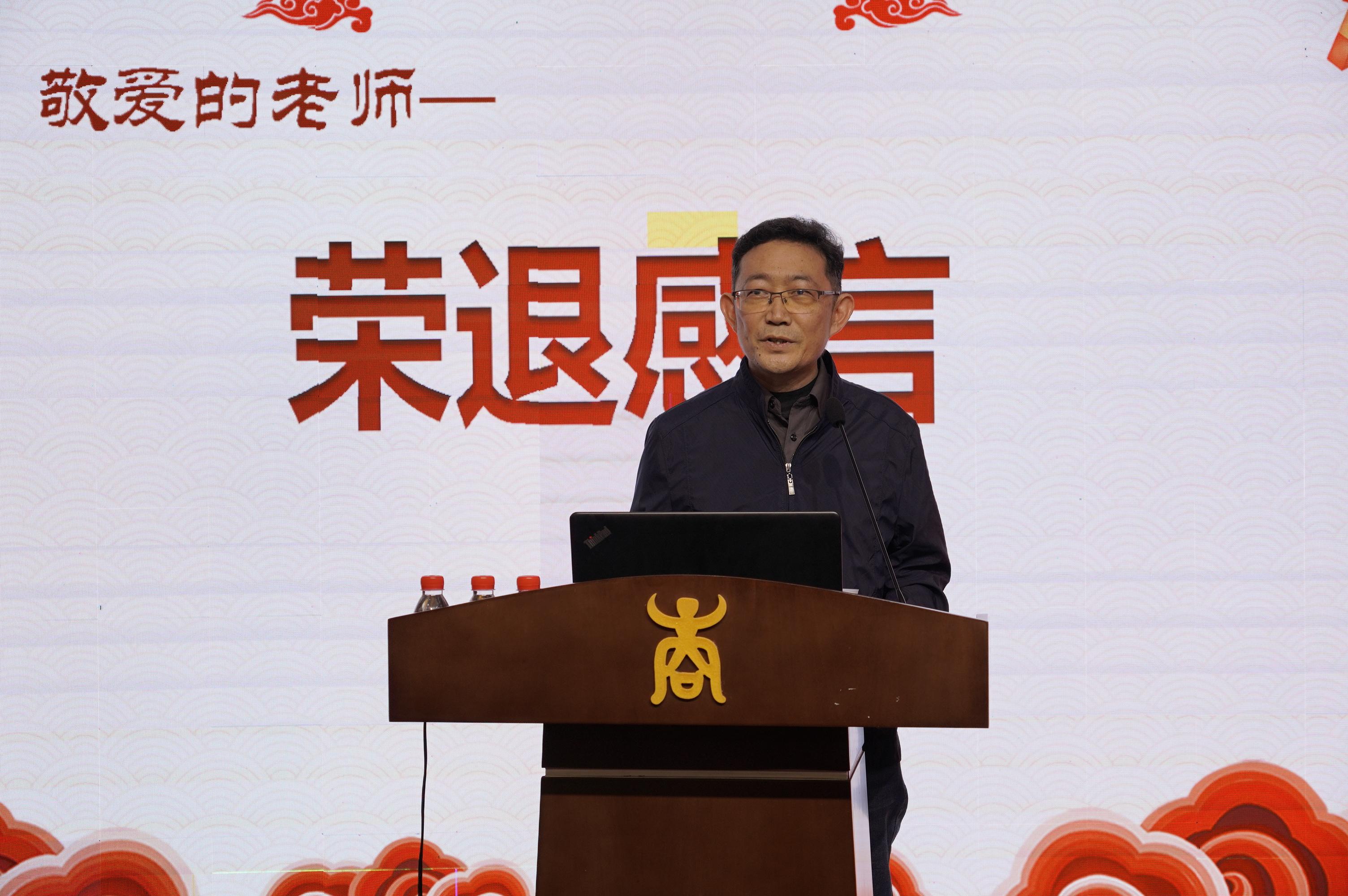 梁戈夫、刘亚萍、汪涛、计春阳、王关宁、王磊荣、李立民等8位退休教师先后上台发表荣退感言。他们深情回顾学院发展历程,总结从教心得,提炼人生箴言,回忆共同奋斗、风雨同舟的感人情景,体现对教师这份职业的热爱和职业生涯的无悔,叮咛老师们珍惜现在的课堂时光,并衷心祝愿学院和学校的发展蒸蒸日上。