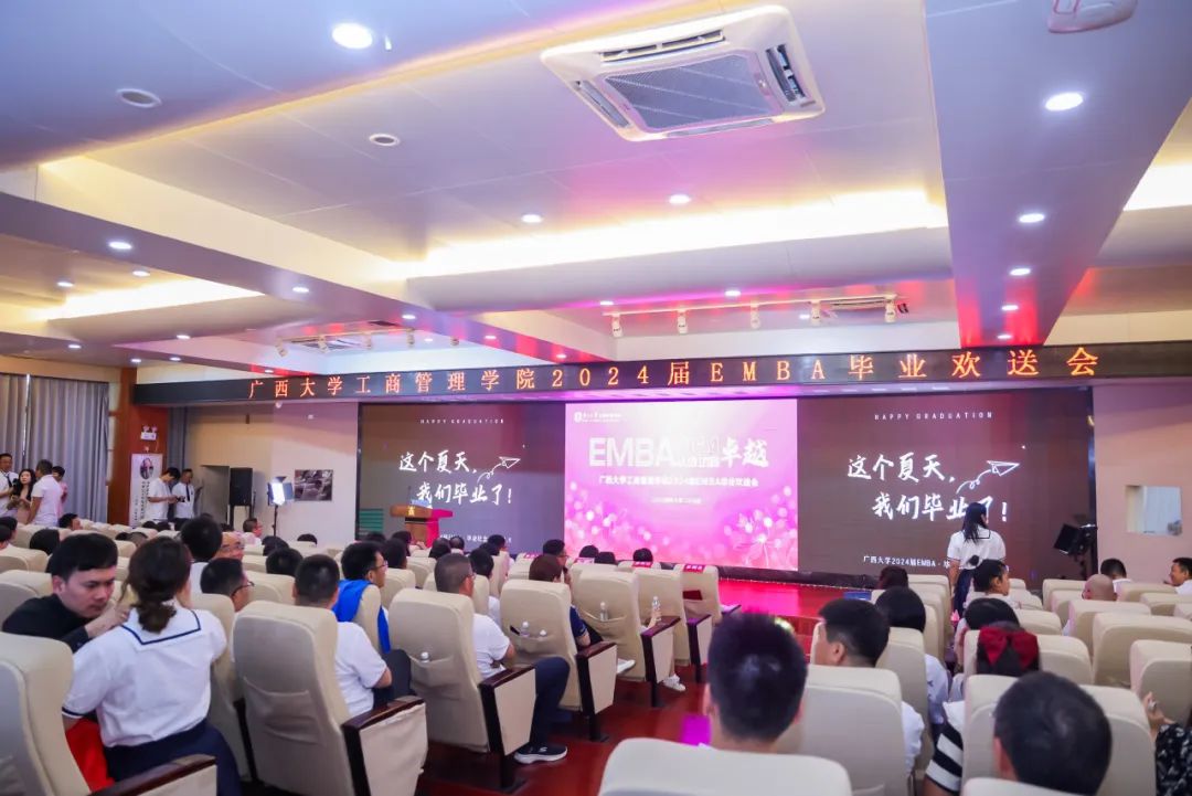 128报告厅掌声不断。学院党委副书记肖克宁,副院长朱少英、申韬、刘民坤、廖东红,导师代表唐玉生、覃朝勇等老师与毕业生们欢聚一堂,共襄2024届EMBA毕业生欢送会,为毕业生们送上最真挚的祝愿。