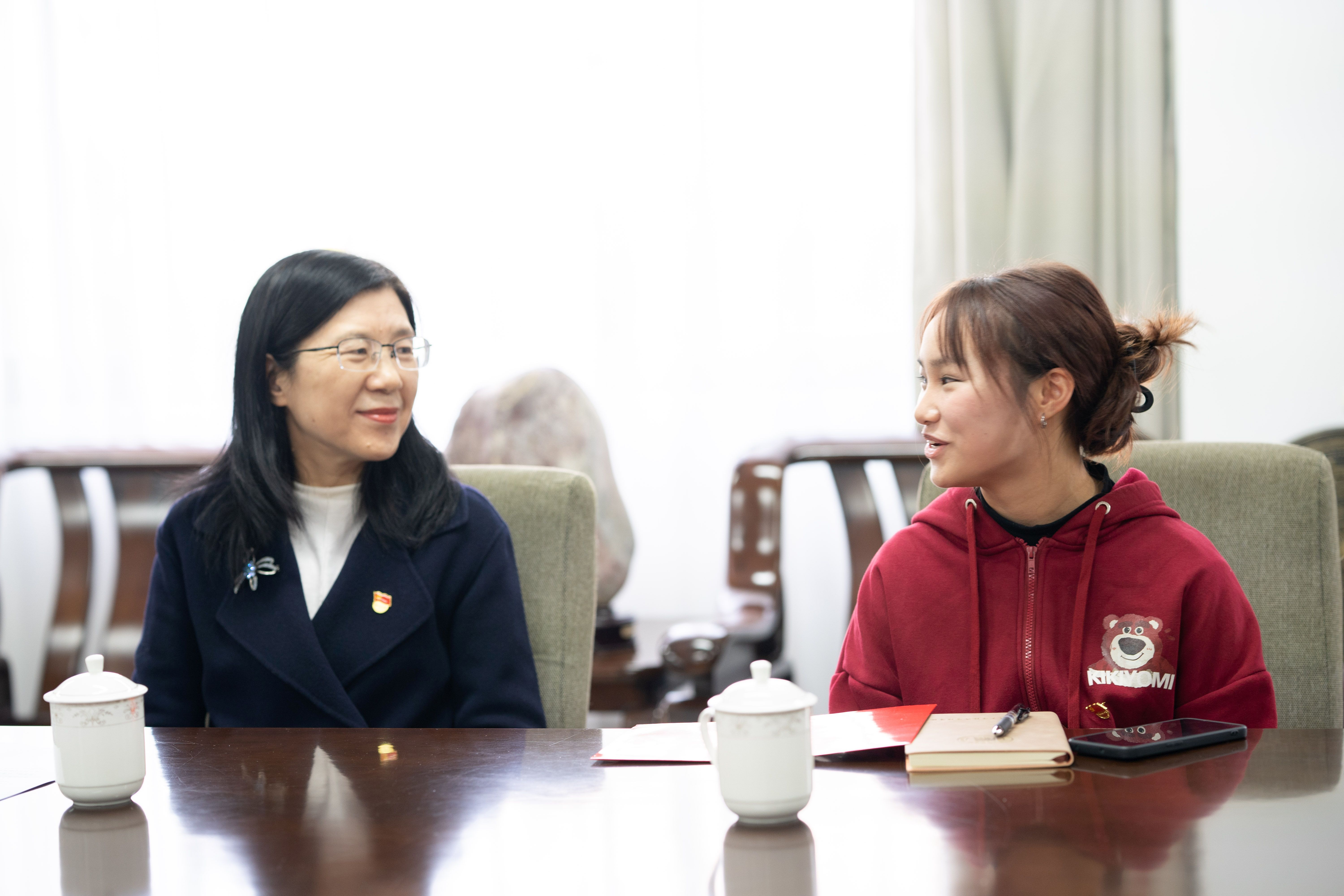 “平时学习忙不忙?”“生活上都有些什么困难?”金顺南亲切询问了韦尹洁的家庭情况和学习、生活方面的基本情况,对韦尹洁在面对困境时依然保持积极向上的乐观态度表示赞赏,称赞她阳光开朗的性格感染了身边的人,为周围同学树立了良好的榜样。她希望韦尹洁懂得感恩,珍惜来之不易的学习机会,将感恩之心化作前行的动力,用实际行动践行党员的初心和使命。她鼓励韦尹洁继续努力学习,积极参加学校和学院组织的各项活动,不断提升自己的综合素质,将来为国家和社会的发展做出贡献。