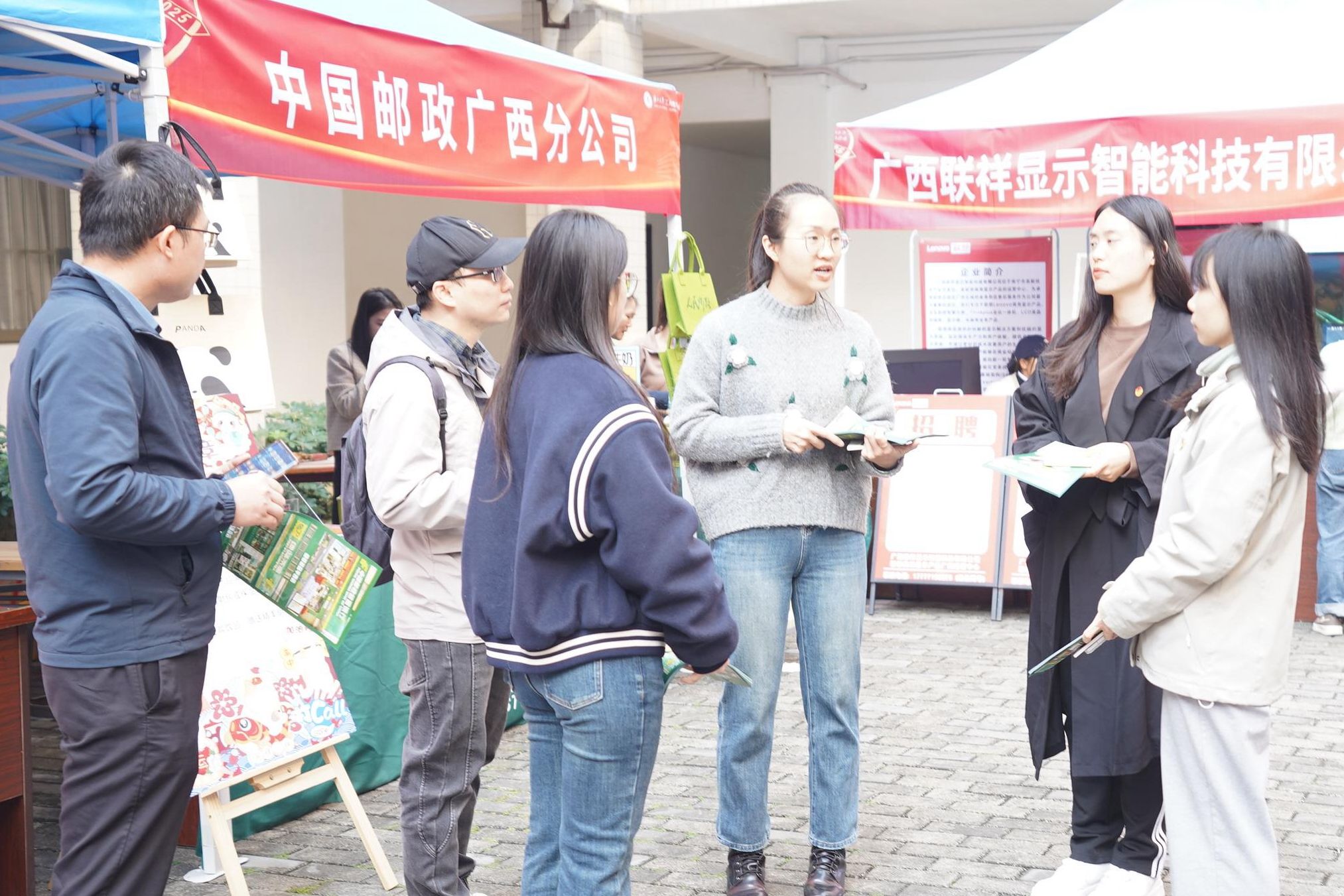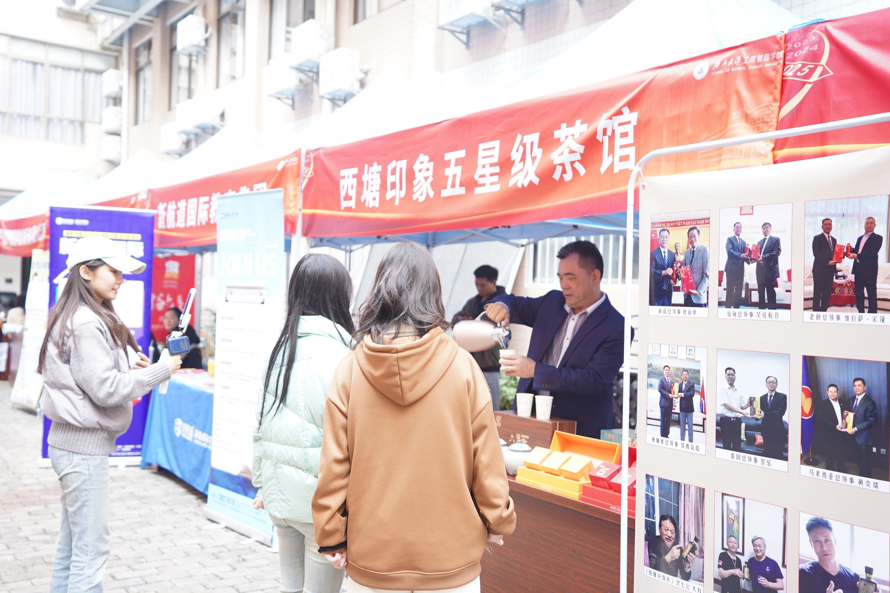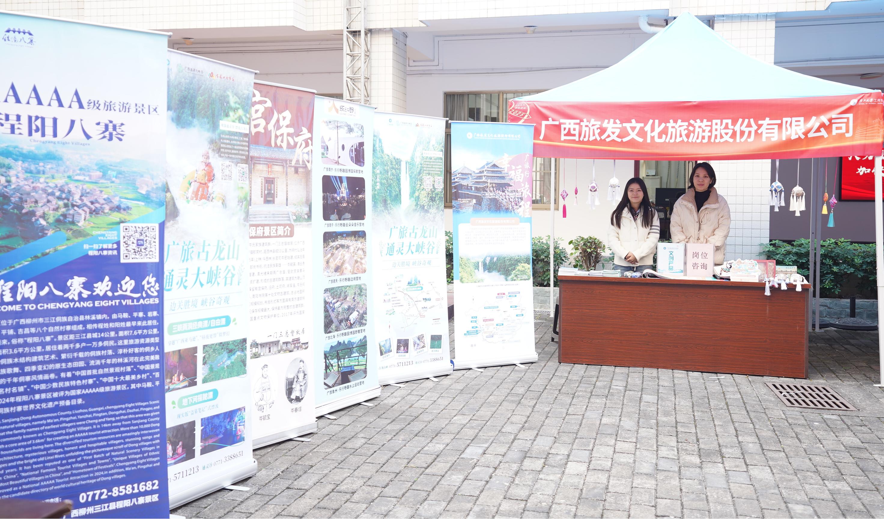 活动中,广西旅发文化旅游股份有限公司、中国邮政广西分公司等校友企业通过产品演示、文化分享,展现了行业前沿动态,如文创非遗产品体验、茉莉花奶茶品鉴等,拓宽了师生视野。三亩山农业发展有限公司、卫君睡眠医学诊所等企业带来了特色洗护用品、植物精油喷雾等健康产品,深受大家喜爱。新航道国际教育集团等教育机构则激发了学生职业规划的兴趣。此外,广西爱生多维长寿口腔科技有限公司、广西联祥显示智能科技有限公司、广西药膳食养协会、南宁市水明漾餐饮投资有限公司、广西龙云山茶业集团有限公司、南宁申科酒庄、忆千年酱香白酒、广西南宁持与茶文化有限公司、梧州市富谷六堡茶有限公司、广西君武行文化科技有限公司、西塘印象五星级茶馆等企业带来的高科技产品展示、特色产品展示、药膳养生讲解、茶艺文化体验等环节同样亮点纷呈。不少校友企业还为学生提供了多个就业岗位。