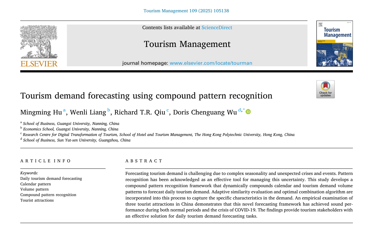 胡明明团队在基于复合模式识别的旅游需求预测领域取得新进展,研究成果以“Tourism demand forecasting using compound pattern recognition”为题,在旅游管理国际三大顶刊之一的《Tourism Management》上发表。论文的第一作者为av片