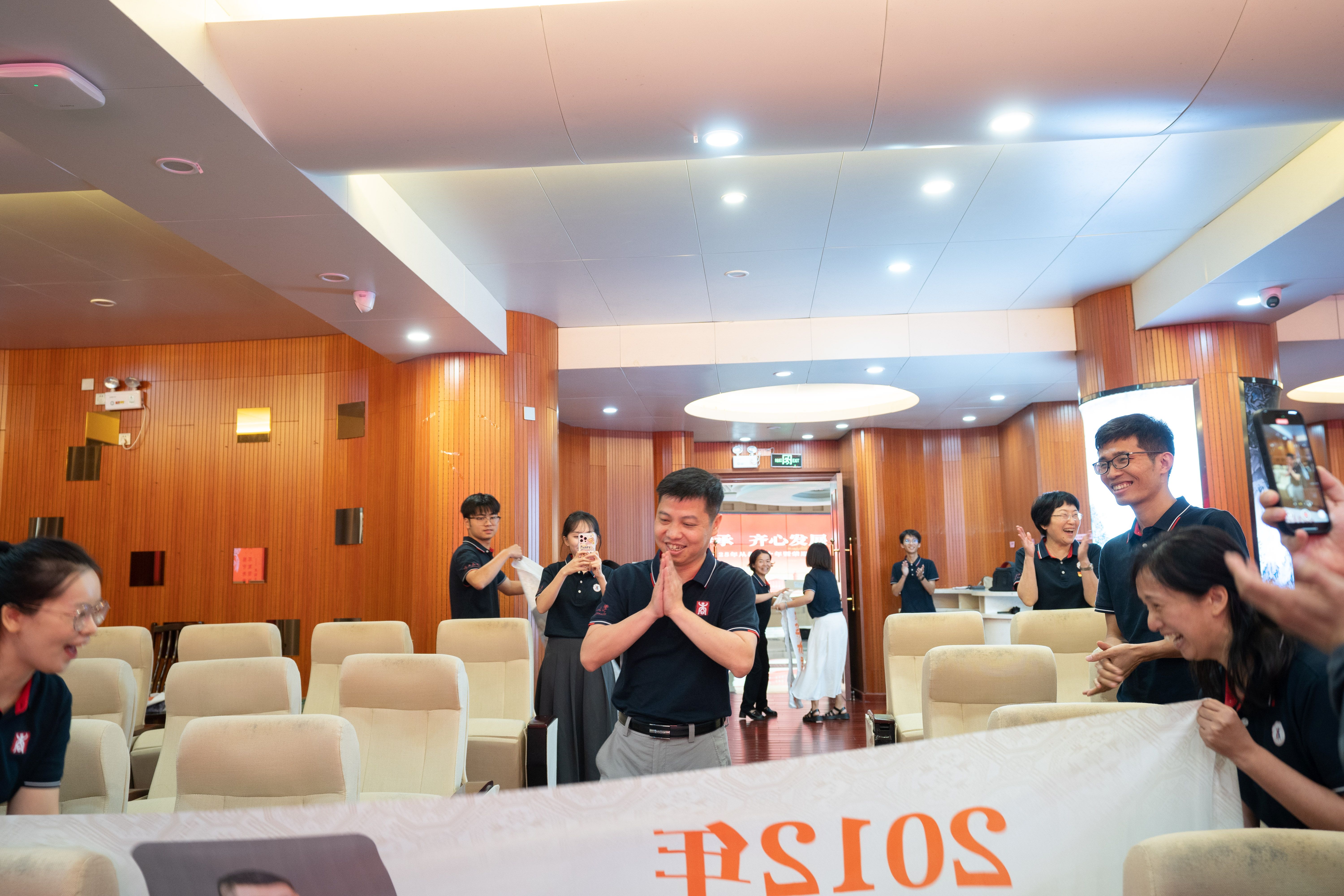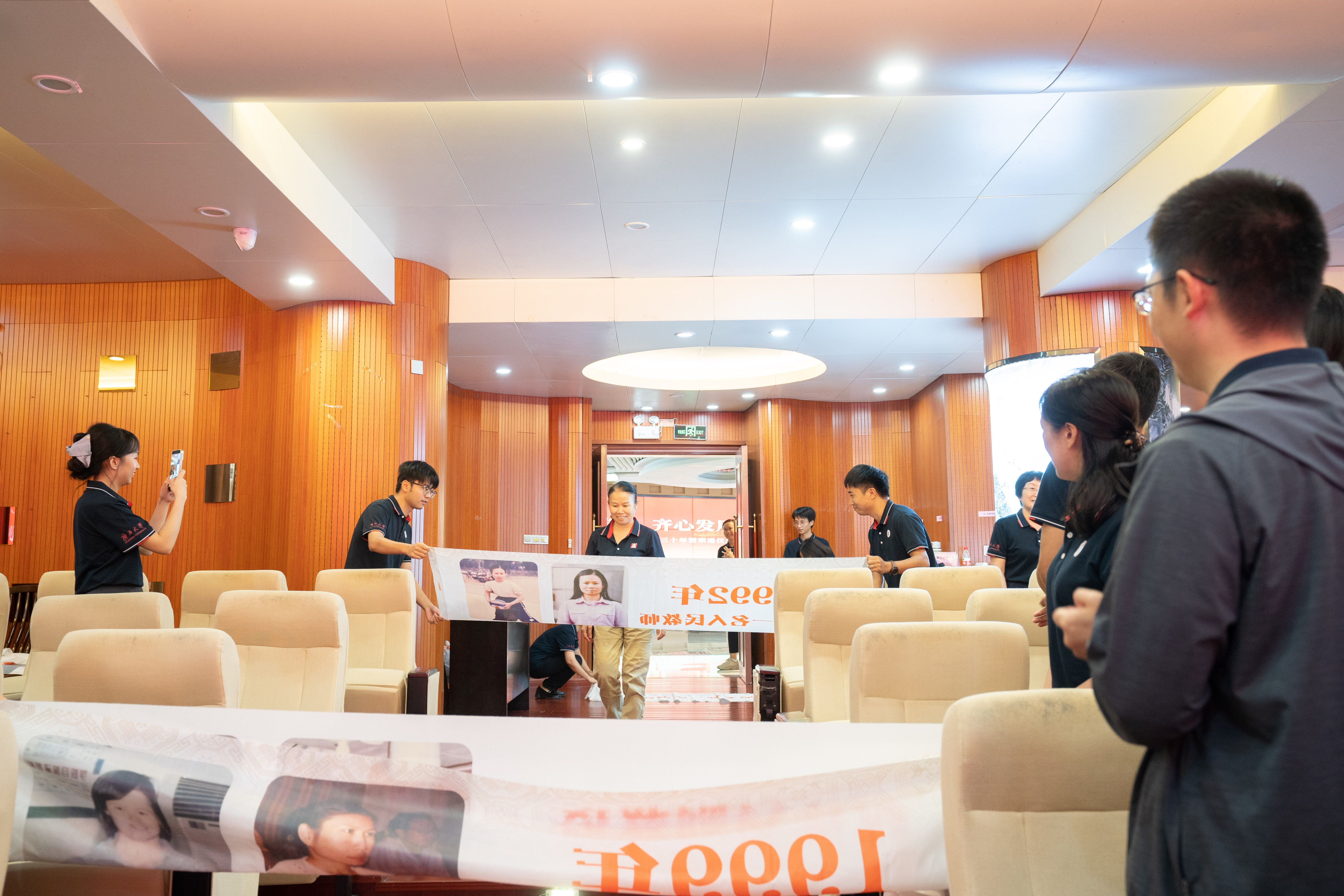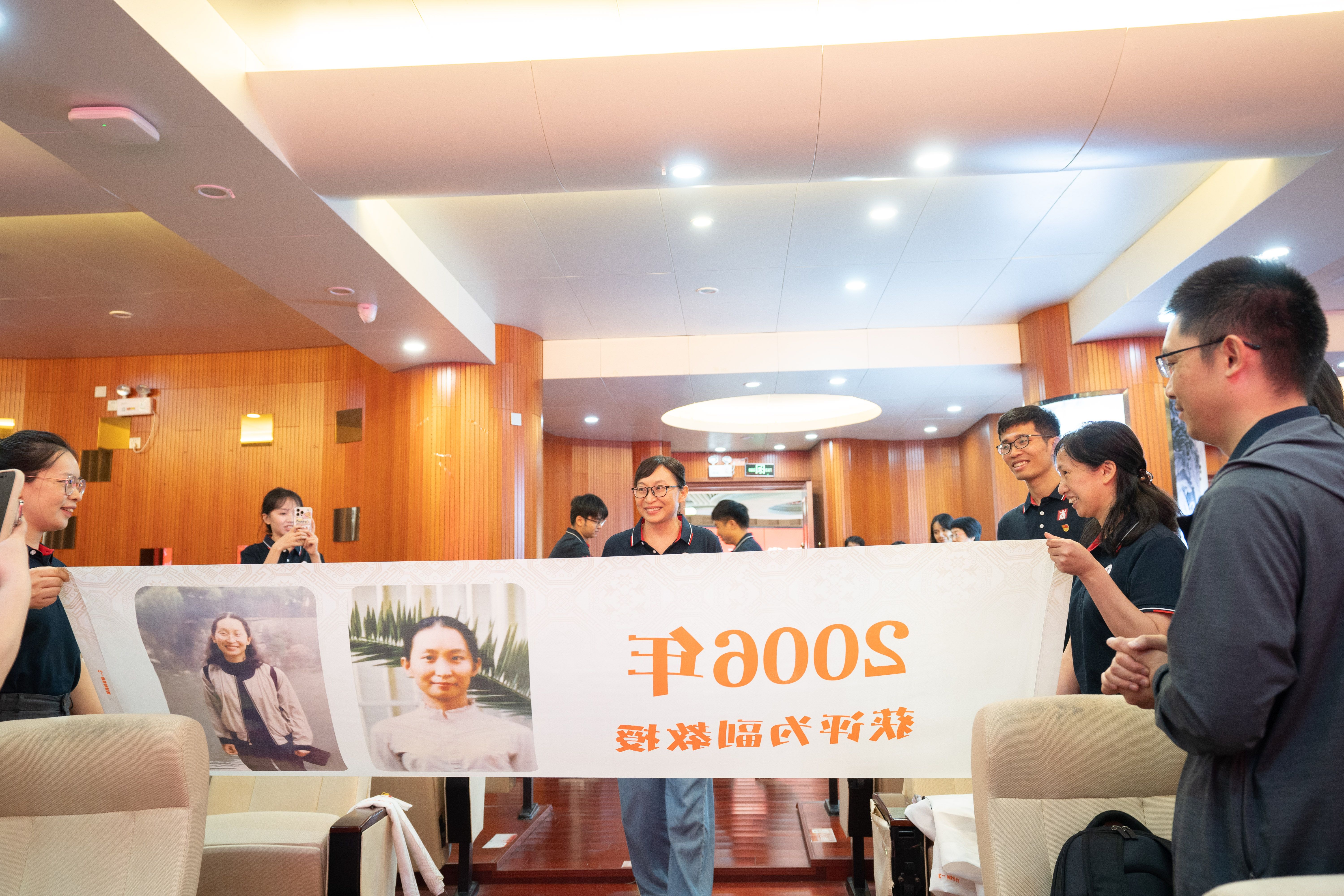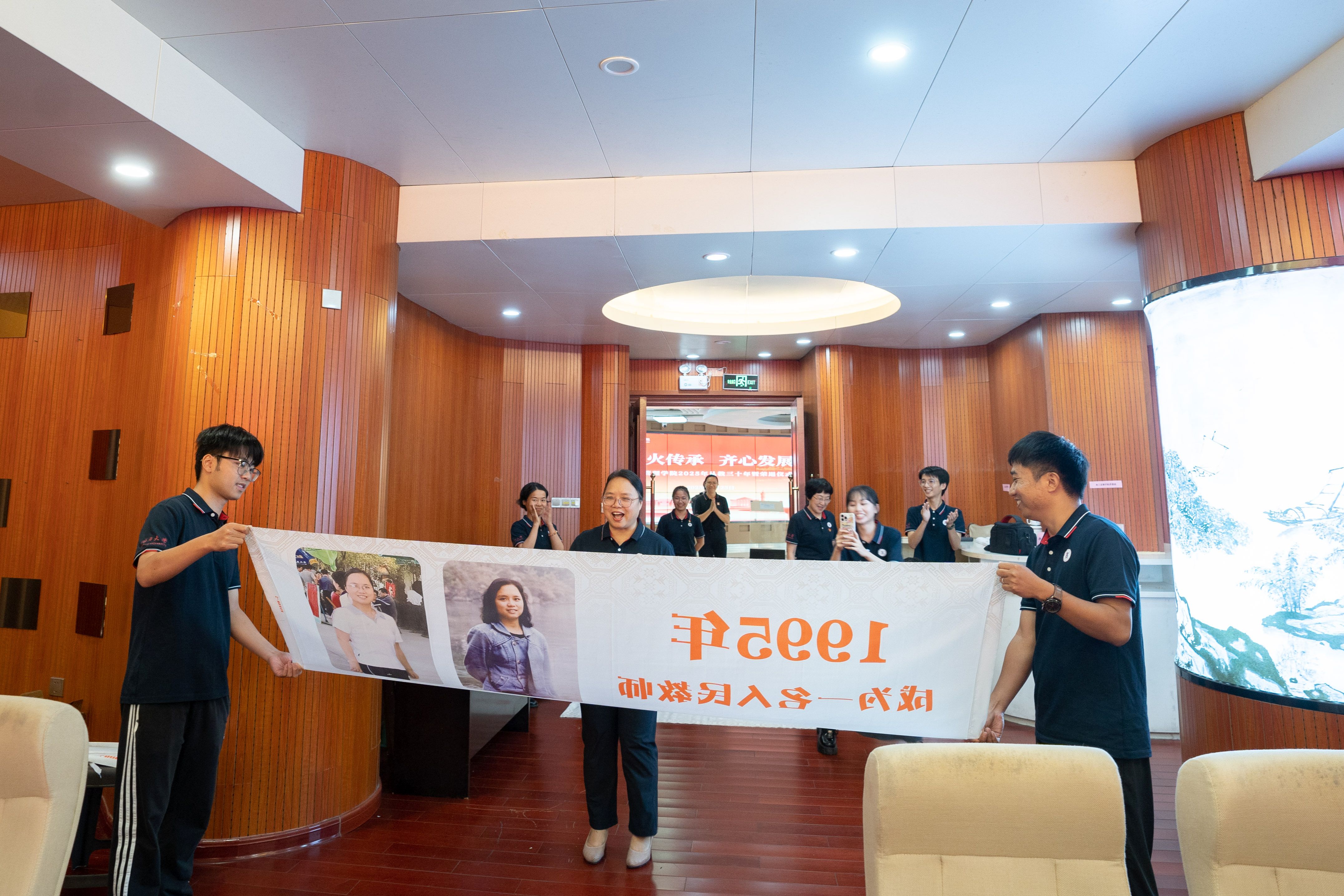 当朱少英、韦铁、滕莉莉、张星文四位从教三十年的老师和2025年荣退的潘思谕老师依次步入报告厅,现场迎来首个温情高潮。学院精心设计的五组纪念横幅沿通道徐徐展开,每幅横幅以时间轴形式呈现他们职业生涯的关键节点:从初登讲台的青涩岁月,到获评职称的重要时刻;从一名普通教师的平凡瞬间,到独当一面的专业负责人……这些珍贵的画面在横幅上一一展现,勾勒出最动人的“奉献长卷”,让在场的每一个人都能深刻感受到他们从教多年的坚守与付出。五位老师看着横幅上的自己,眼中闪烁着泪光,那是回忆的光芒,也是对教育事业深厚情感的流露。