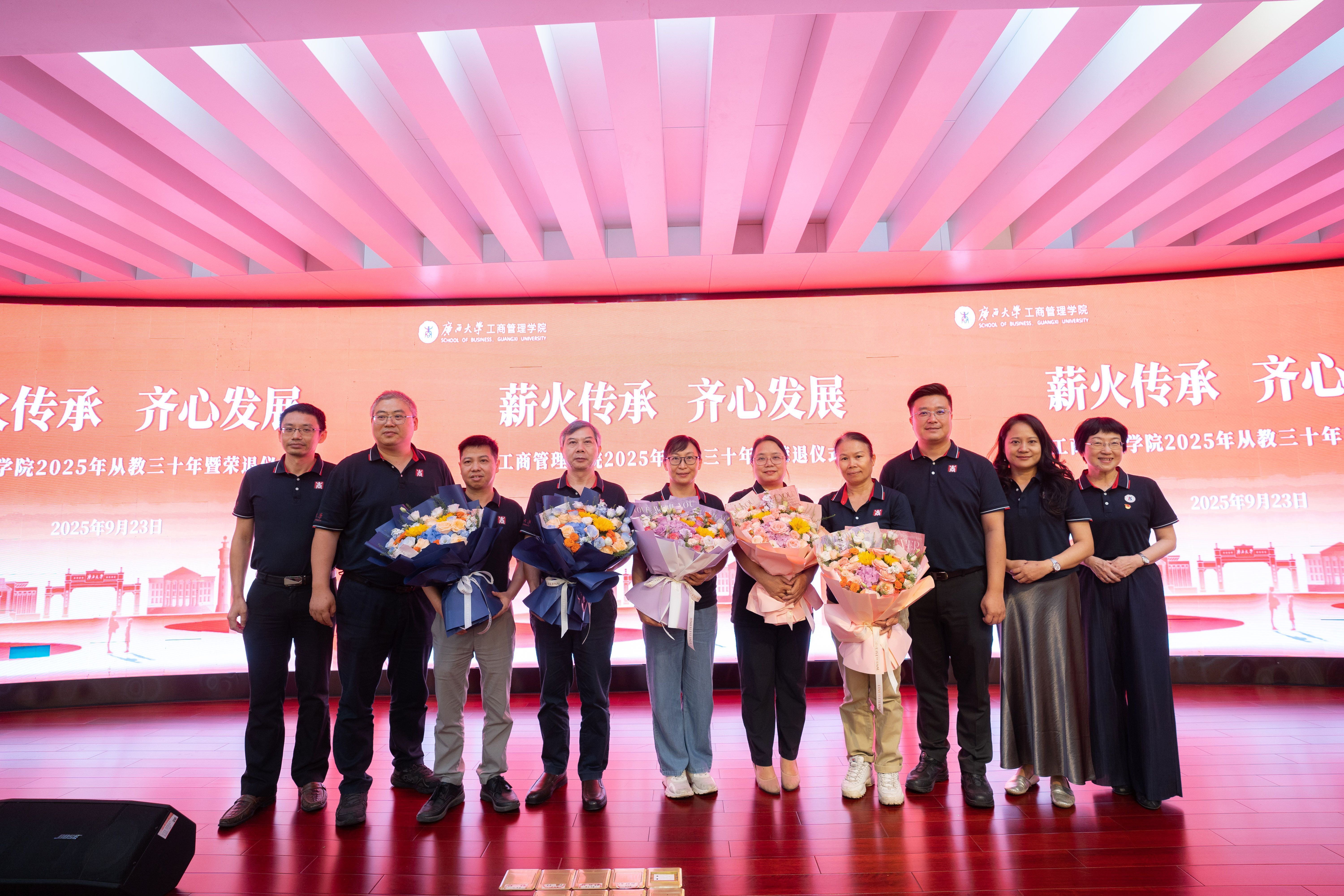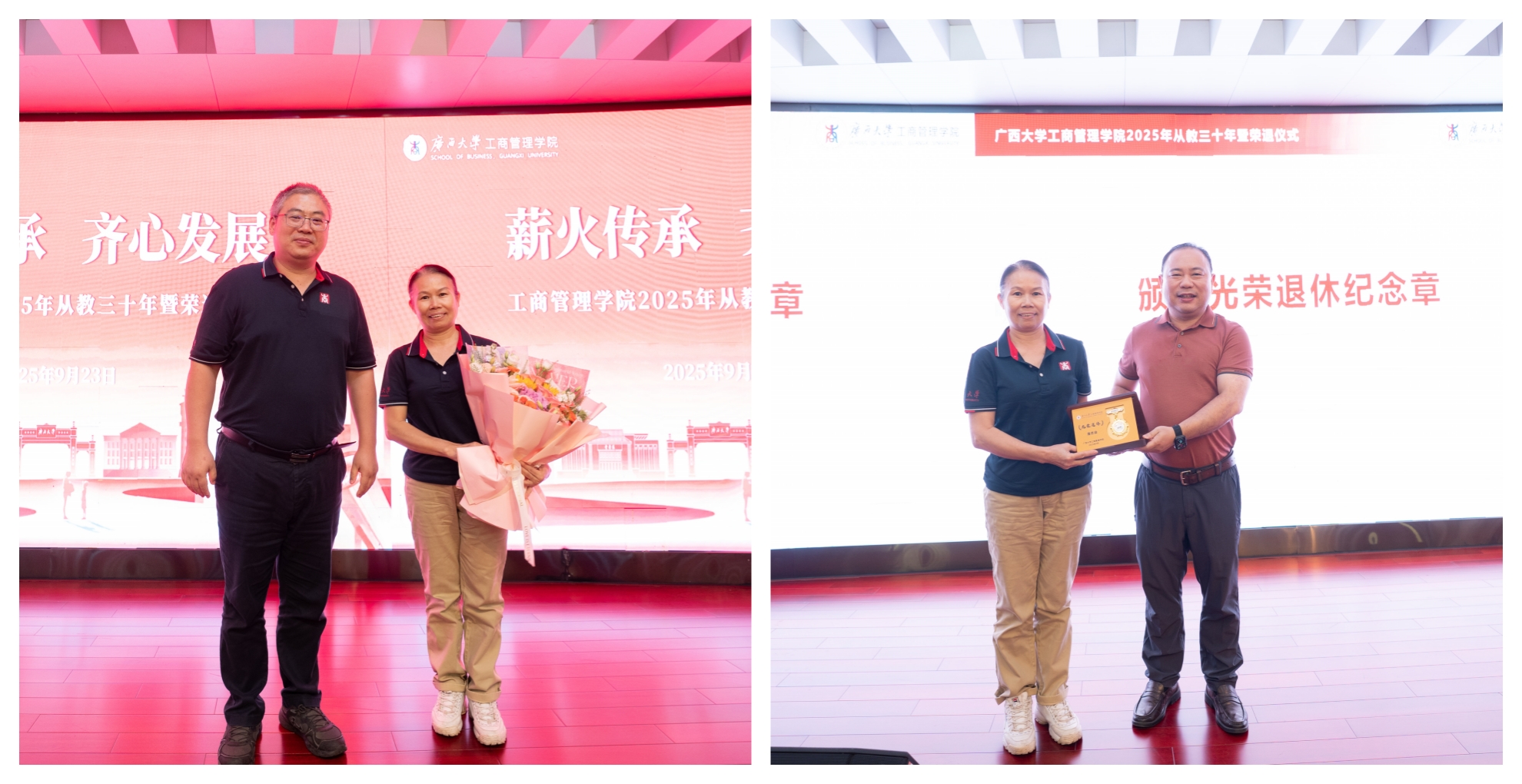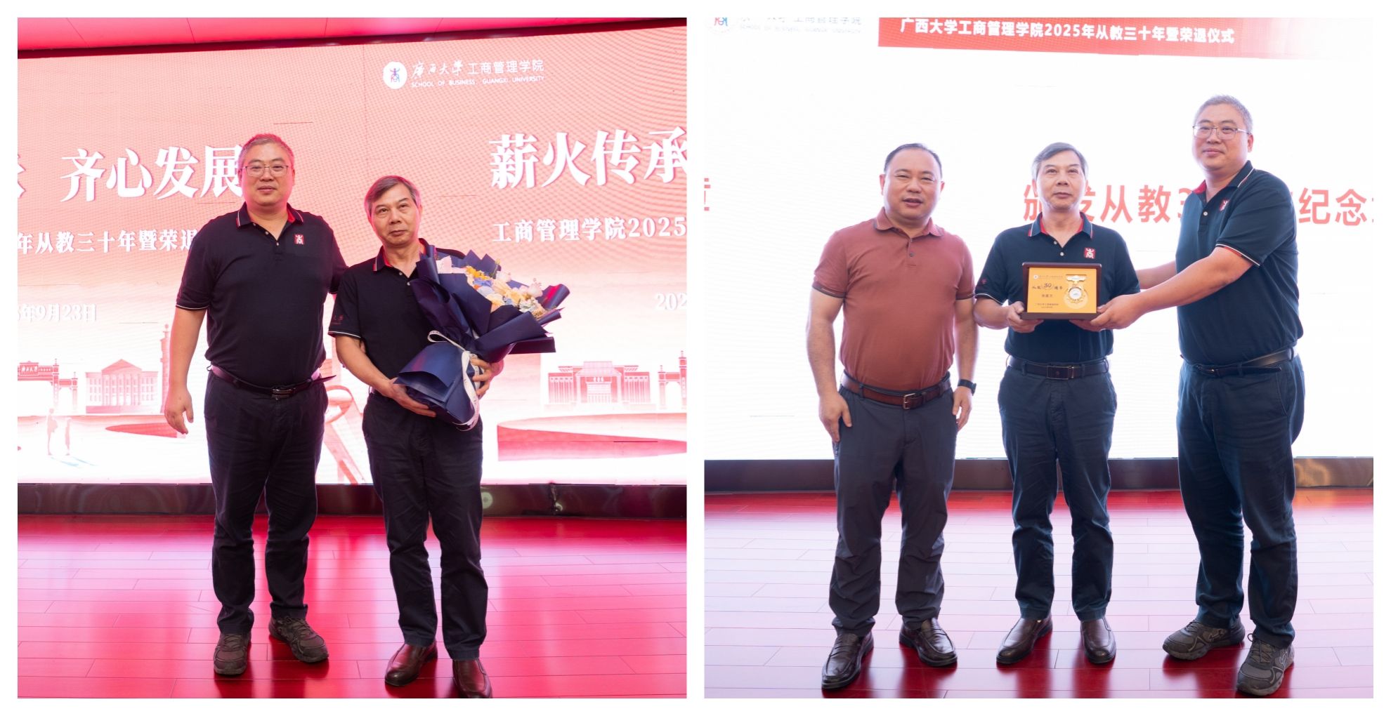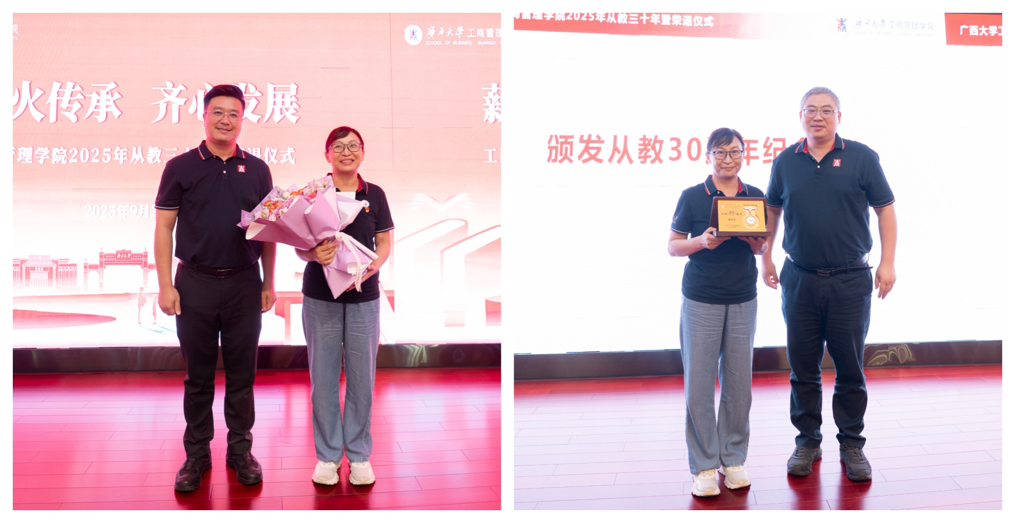 为大力弘扬教育家精神,进一步营造尊师重教良好氛围,9月23日下午,学院128报告厅内乐声悠扬、暖意融融,学院党委书记黄晋、院长朱帮助,党委副书记肖克宁,副院长朱少英、申韬、廖东红、韦铁,学校科研平台建设管理处副处长刘民坤与全院教职工欢聚一堂,举行2025年从教三十年暨荣退仪式,向五位教育工作者致以崇高敬意。