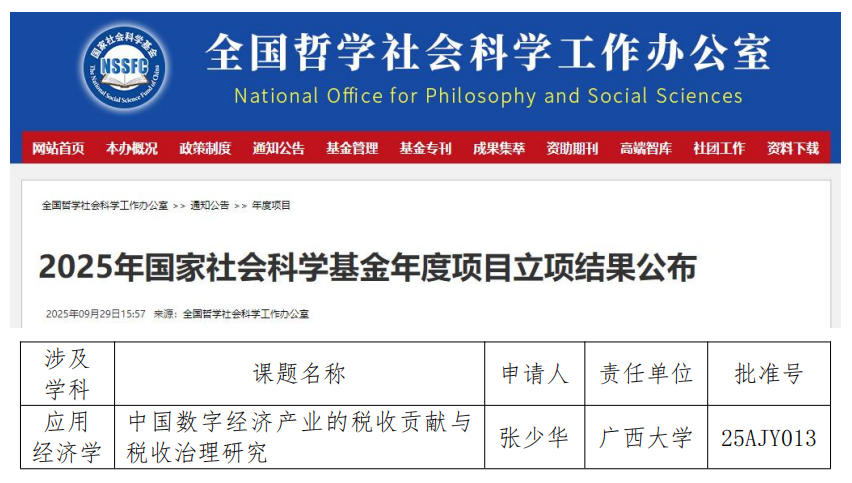 张少华教授申报的《中国数字经济产业的税收贡献与税收治理研究》课题获得重点项目立项。