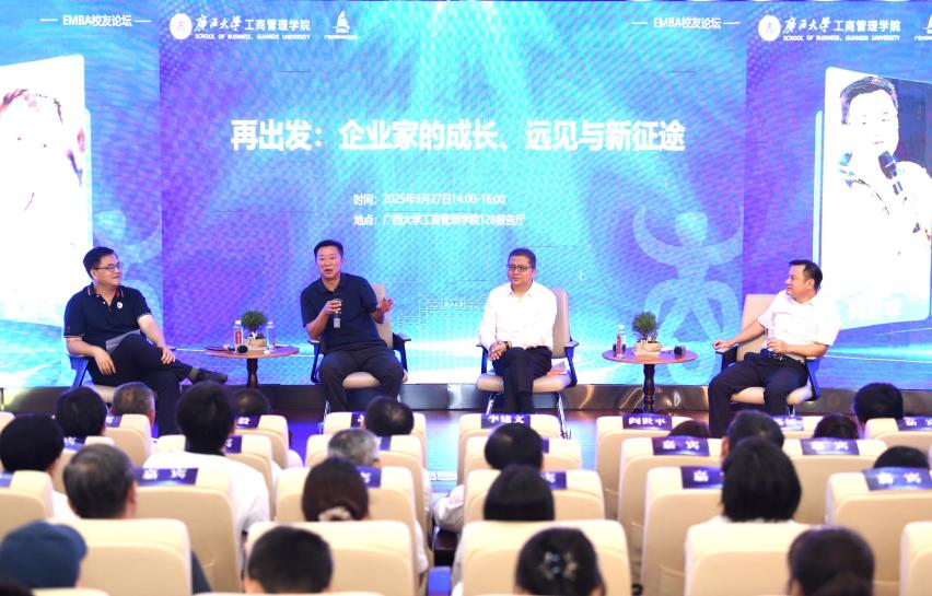 EMBA三班校友、环球新材国际控股有限公司董事局主席兼行政总裁苏尔田,以“三个十年”为叙事主线,分享了自己从乡村青年到跨国企业掌舵者的蜕变历程。EMBA三班校友、广西英伦信息技术股份有限公司董事长黎英征,以“成长、思考与新征程”为题,结合自身华为工作经历与创业实践,分享了对企业经营的深度洞察。座谈交流环节,EMBA三班校友李建文作为特邀嘉宾参与对话,与现场校友围绕“企业传承与创新的平衡之道”“战略转型中的团队融合路径”等实际问题展开深入探讨,现场氛围热烈。