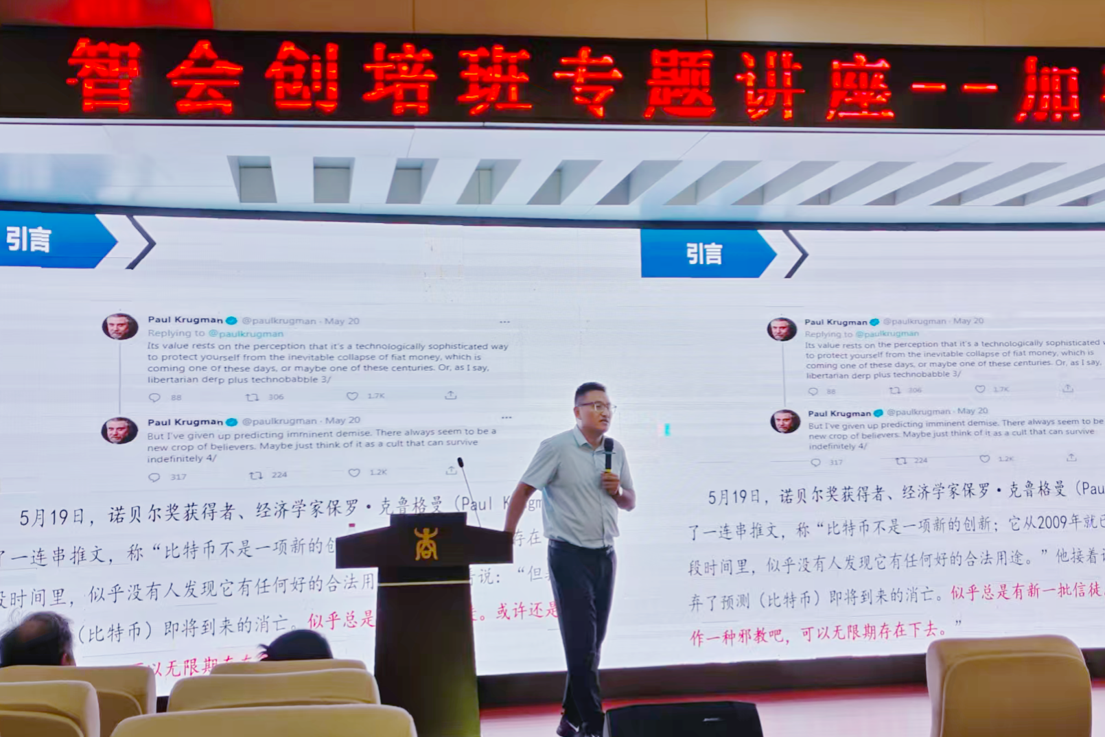 高斌以《加密货币与大国博弈》为题,系统讲解了加密货币的基础知识,深入剖析了其对全球经济格局产生的深远影响,并详细解读了主要国家在加密货币领域的政策态度与博弈态势。课程内容层层递进,不仅引导同学们思考加密货币对财务合规与金融市场带来的挑战与机遇,更激发了大家对金融科技前沿的浓厚兴趣。同学们认真听讲,在互动环节中积极提问,与高斌深入交流,现场学习气氛热烈。