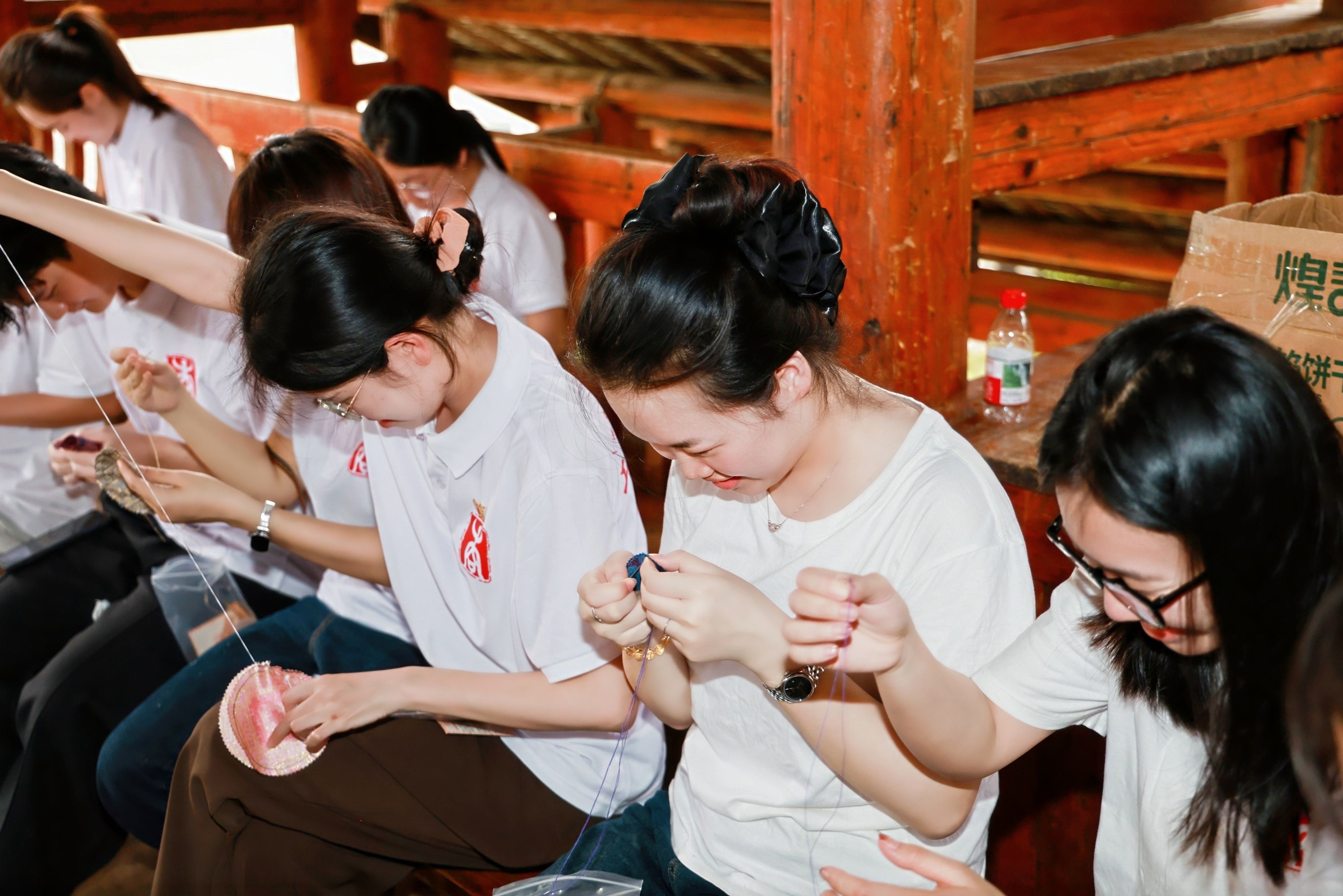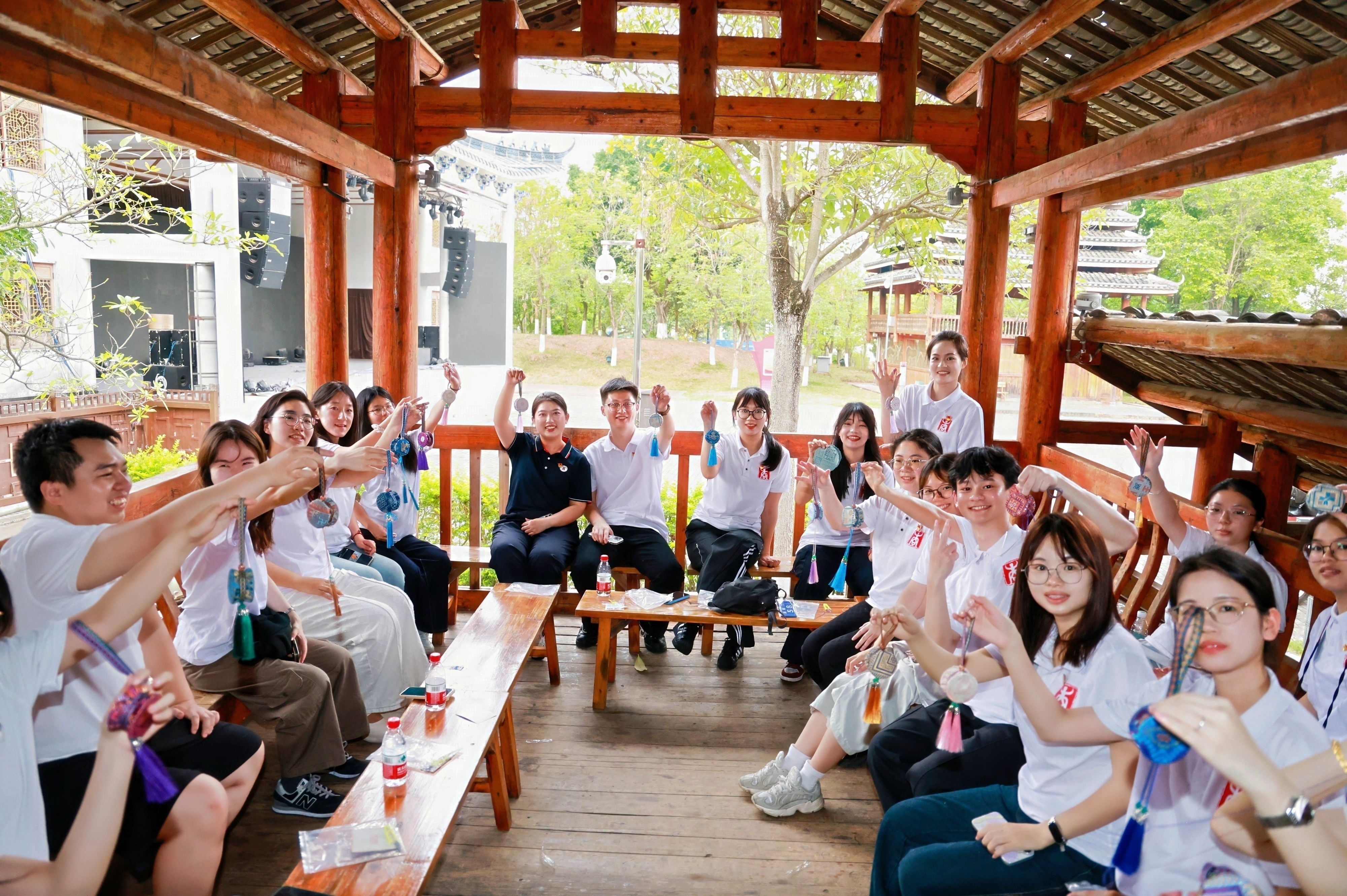 随后,师生们还一起体验了非遗手工壮锦香包的制作,在动手实践中进一步增进了对非遗文化的理解与鉴赏。此次主题活动,将沉浸式文化参访与面对面思想交流有机结合,不仅让同学们在行走中读懂历史,更在对话中凝聚共识。学院将持续创新思政教育形式,推动铸牢中华民族共同体意识教育走深走实、入脑入心。