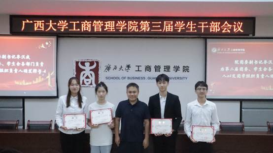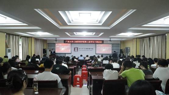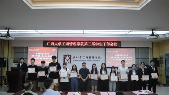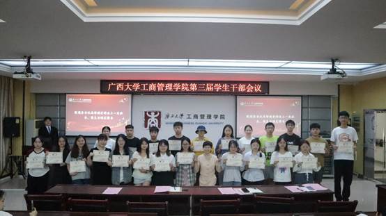 为表彰上一届团学组织干部的工作,增强新一届学生干部的凝聚力,进一步推动学院学生工作管理成效。9月19日下午3点,av片 于学院124教室,召开第三届全体学生干部会议。院党委副书记黄晋、院团委书记马丽娟、院团委副书记岑汉成、院学生辅导员莫秀德、郁文丹出席本次会议。