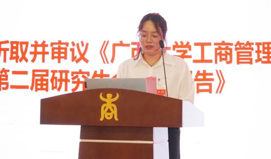 党委副书记黄晋、团委书记马丽娟、党委组织员黄照温、学工组辅导员张艳红、校研究生会主席团代表李志强、经济学院/中国-东盟金融合作学院研究生会主席团代表张丽欣、大会筹备委员会主席团以及学院研究生班级学生代表参加本次会议。