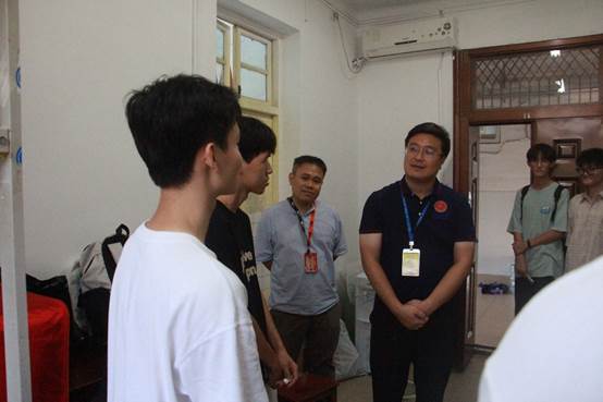 学院党委副书记黄晋和团委副书记岑汉成,走进本科生男生新生宿舍,关怀与问候每一位23级新生。他们认真询问新生来校路途情况,了解新生在学习、生活方面的需求,关心各地同学对广西气候适应情况,耐心解答各个同学来校后遇到的实际困难。