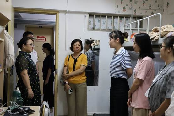 学院副院长朱少英、研究生管理中心主任叶映、年级辅导员张艳红以及新生班主任等领导老师前往2023级研究生新生宿舍进行走访,向新生们致以热情的欢迎和亲切的问候。她们询问新生们在生活方面的适应情况以及遇到的困难和问题等,并耐心解答学生们提出的各种问题,深切叮嘱了同学们注意寝室用电安全,注重维护整洁的寝室环境,合理调整好自己的心理状态和生活节奏,及早做好学术科研上的规划,为刚进校园的学生们送去了温情的关怀。