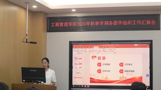 2023年秋季学期各团学组织工作汇报会于学院233会议室举行。院党委副书记黄晋、院团委书记马丽娟、院团委副书记岑汉成、学工组辅导员张艳红、王乐、莫秀徳、郁文丹参与并指导学生干部开展工作。汇报会分上下半场进行,上午由研究生团学组织进行汇报,下午由本科生团学组织开展汇报。