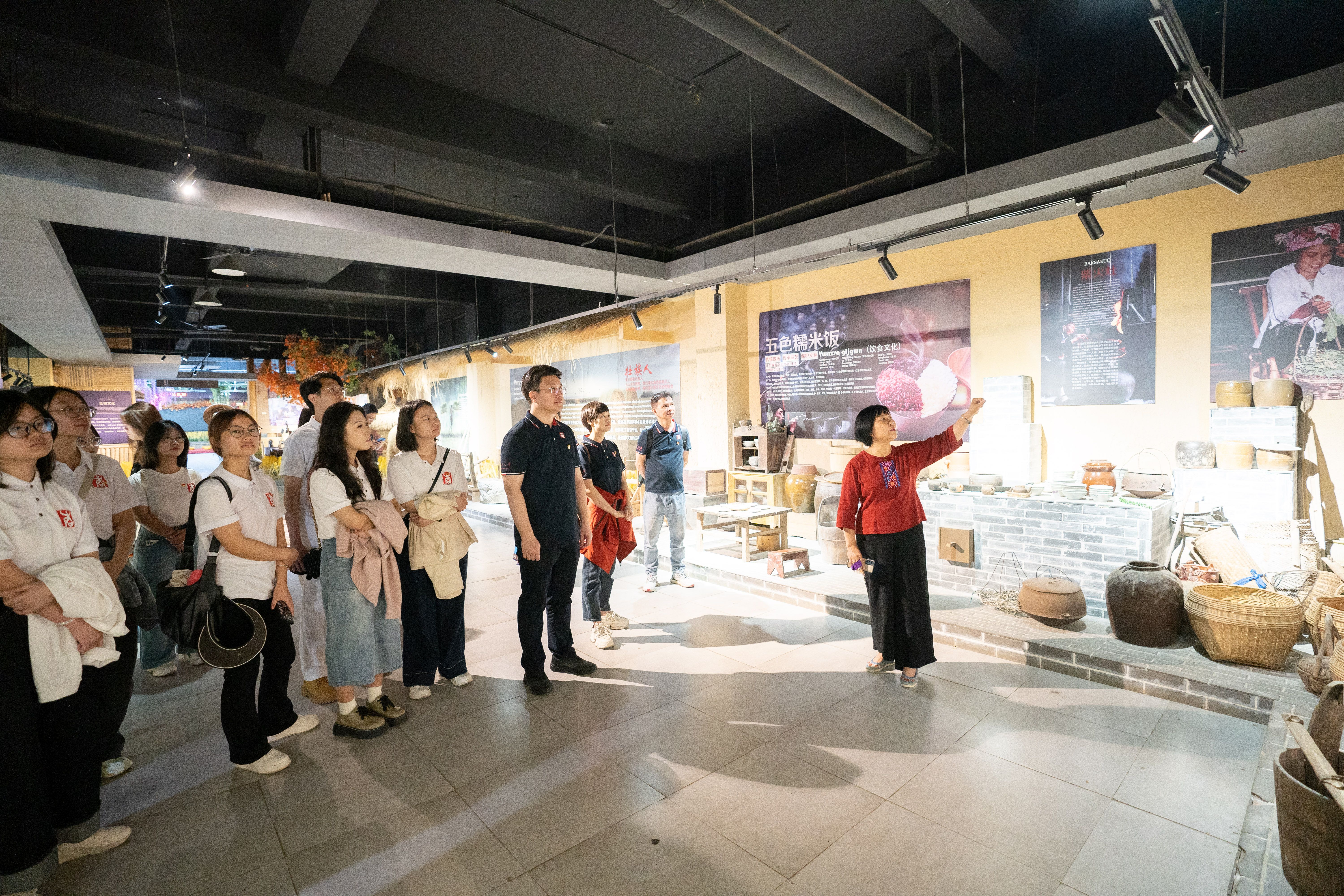 动手制作五色糯米饭的环节同样引人入胜。师生们围坐在长桌旁,桌上摆满了糯米、植物染料和各种制作工具。在专业老师的指导下,大家小心翼翼地将红、黄、黑、白、紫的糯米创意地制作自己喜欢的图案。大家一边操作,一边交流,了解了糯米饭的染色技艺以及“五色”的文化内涵,现场气氛热烈融洽。