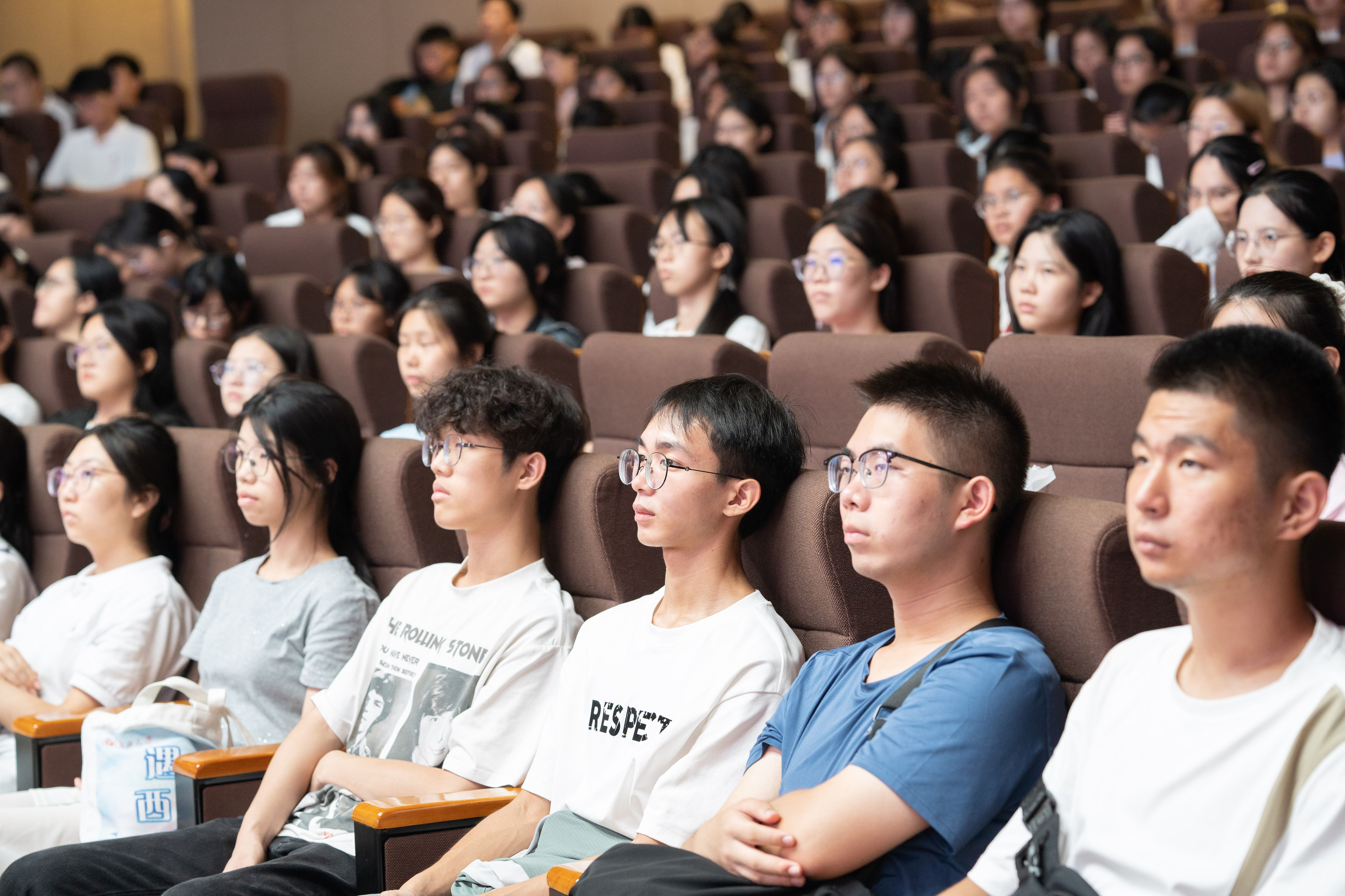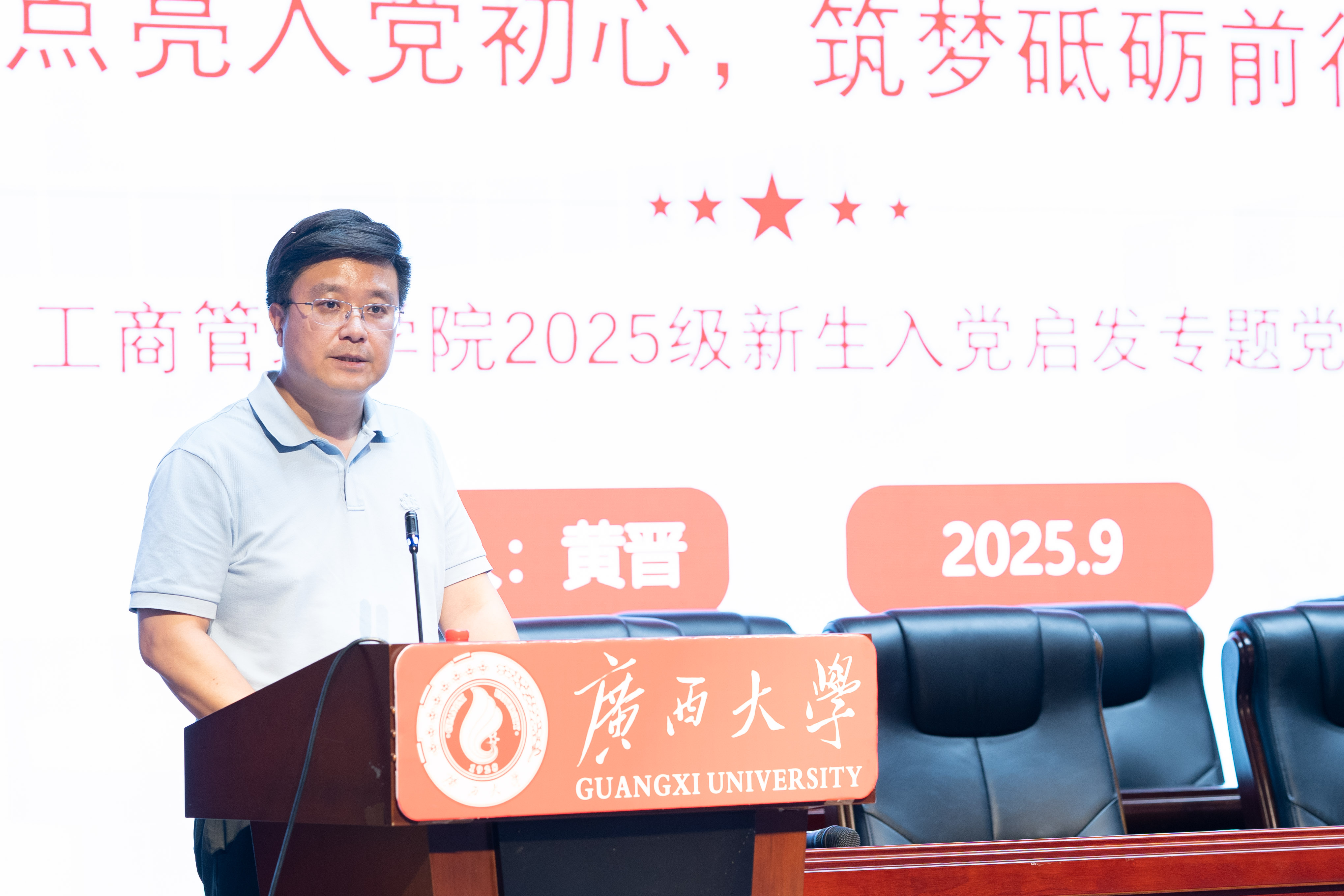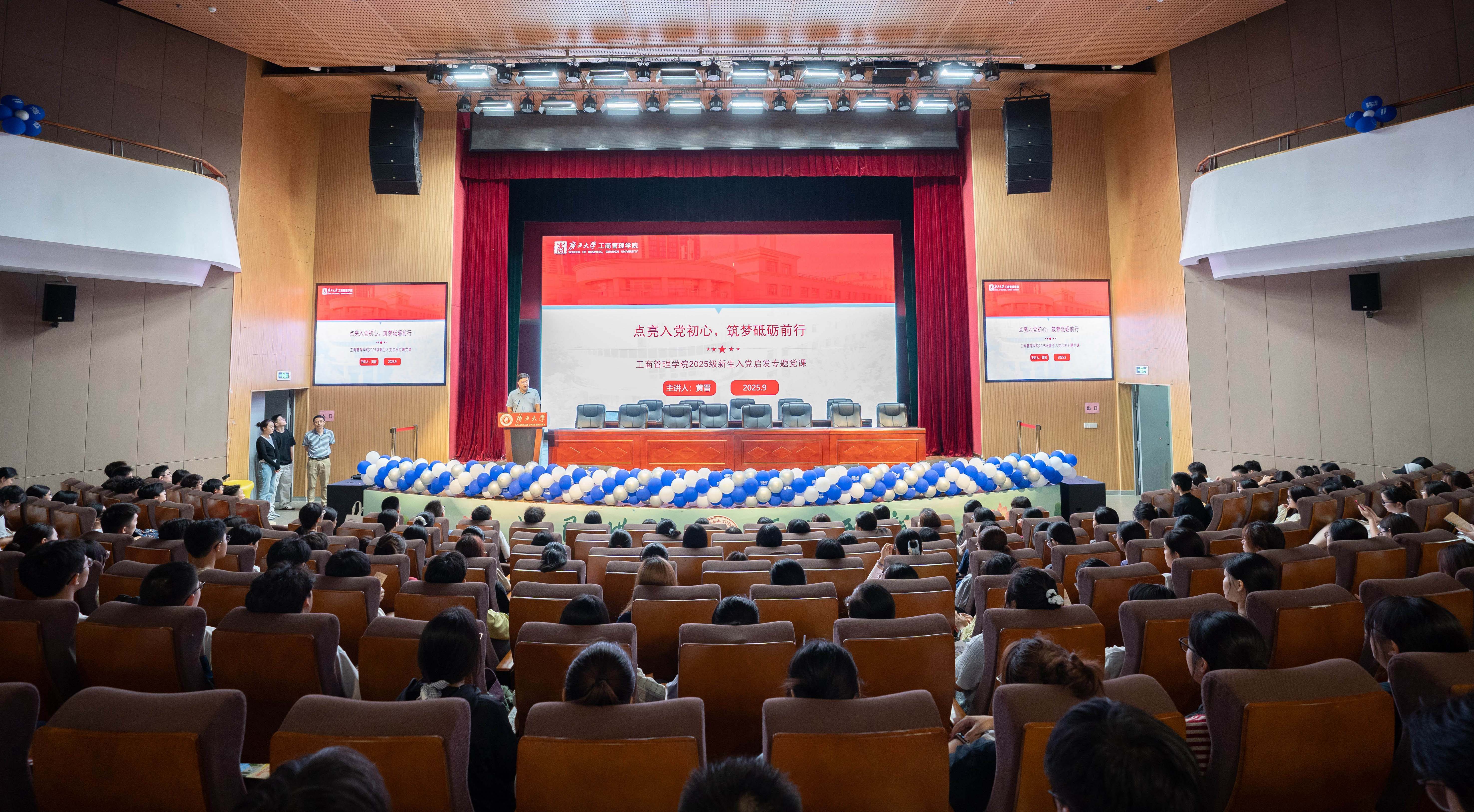 党委在学校大学生活动中心小剧场举办2025级新生入党启发教育专题党课。专题党课由学院党委书记黄晋主讲,党委副书记肖克宁、学工组辅导员管雅娣与全体新生一同参与学习。