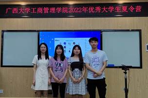 2021级韦梅婷、张舒源、韦欢欢、罗咏诗四位硕士研究生与营员们分享了自己的考研经历,并与营员们进行了深入的互动交流。下午,研管中心黄昱老师带领营员们观看学校宣传片,开展知识抢答,并特邀张家伟(2020级博士)、李姝蓉(2020级硕士)2位优秀在读研究生及海晨颖(2018级)、山冬鲁(2019级)2位优秀校友分享自己研究生阶段学习经验。