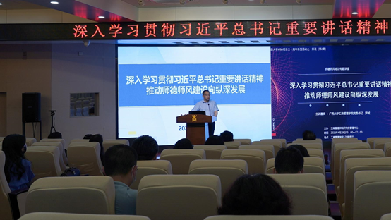 在学院128报告厅举办师德师风培训专题讲座。讲座由学院党委书记罗诚主讲,院党委副书记、院长朱帮助等全体教职员工参会学习,学院研究生管理中心常务副主任叶映副教授主持讲座。