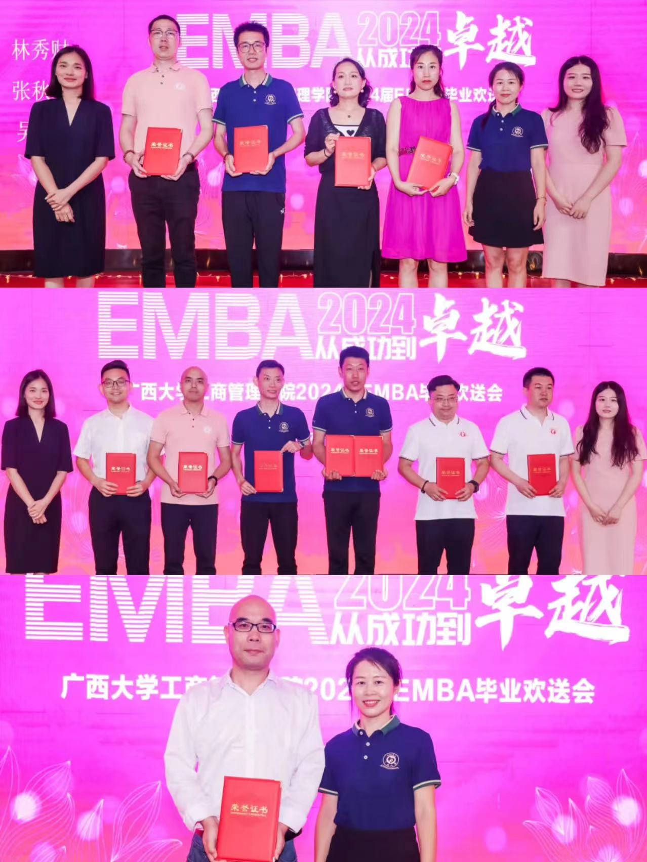 党委副书记肖克宁、副院长朱少英、申韬、刘民坤、廖东红,导师代表唐玉生、覃朝勇等老师出席了欢送会,共同为此次毕业的EMBA同学庆祝。此次欢送会由EMBA21班周艳、EMBA22班居香、EMBA23班陆宏亮主持。