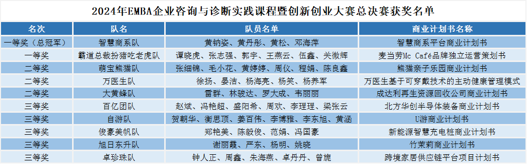 2024年EMBA企业咨询与诊断实践课程暨创新创业大赛总决赛圆满落幕。2024级EMBA学生组成的32个小组,经过选拔赛的比拼,共有10支队伍脱颖而出,凭借总决赛的精彩表现,最终产生一等奖2名、二等奖3名、三等奖5名。