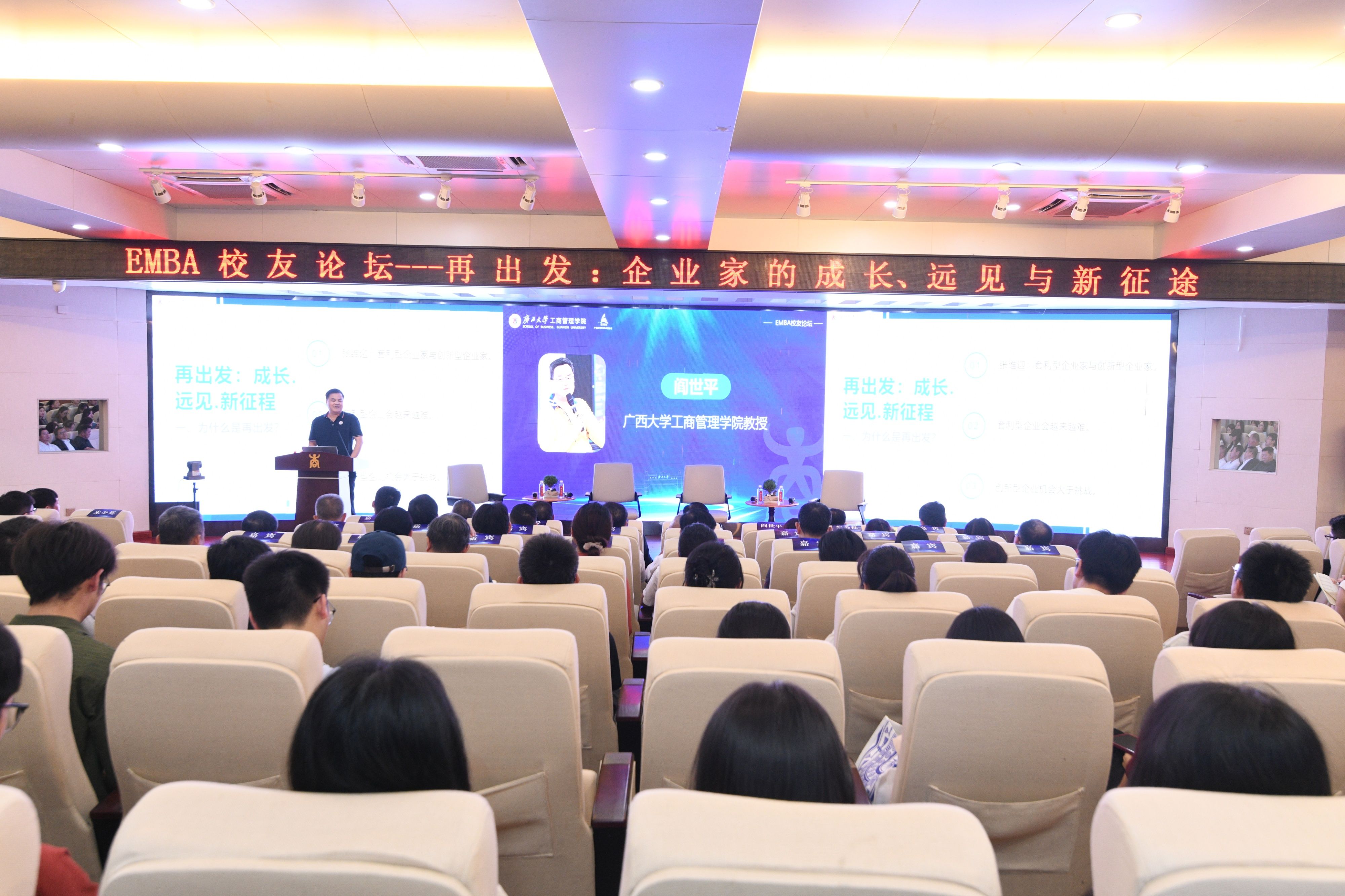 论坛现场,EMBA 三班校友、环球新材国际控股有限公司董事局主席兼行政总裁苏尔田,以 “三个十年” 为叙事主线,分享了自己从乡村青年到跨国企业掌舵者的蜕变历程。他深刻指出,“技术远见、资本布局与人才战略,是企业穿越周期、持续成长的核心动力”。其掌舵的环球新材,通过并购韩国 CQV、德国默克表面业务,已跃居全球珠光材料行业的领军者,生动诠释了“新材料没有天花板”的无限赛道。EMBA三班校友、广西英伦信息技术股份有限公司董事长黎英征,则以“成长、思考与新征程” 为题,结合自身华为工作经历与创业实践,分享了对企业经营的深度洞察。他提出的 “站在未来看现在”“相信概率、尊重周期” 等务实观点,精准击中企业家实践中的痛点,引发在场校友强烈共鸣,不少人现场记录观点、举手追问细节,互动氛围热烈。