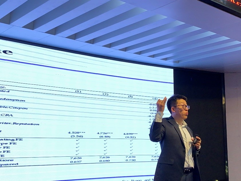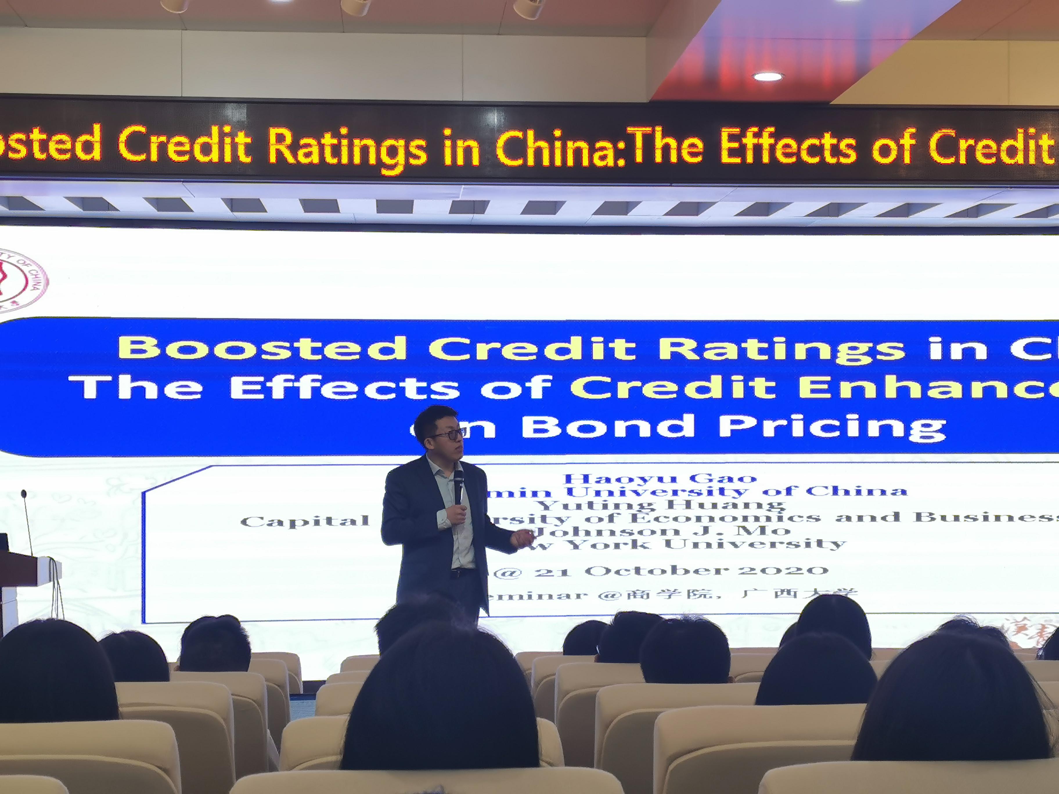 进行学术交流,于商学院128报告厅进行了主题为“Boosted Credit Ratings in China: The Effects of Credit Enhancement on Bond Pricing”的学术报告。