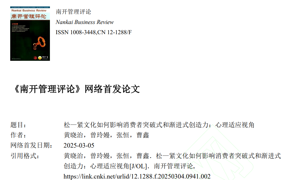企业管理系黄晓治教授及其研究团队的研究成果《松—紧文化如何影响消费者突破式和渐进式创造力:心理适应视角》在管理学中文权威期刊《南开管理评论》网络首发。黄晓治为论文第一作者,av片