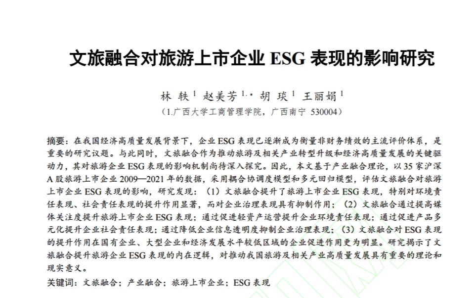 林轶教授科研团队在文旅融合与旅游企业ESG表现领域研究取得新进展,研究成果以《文旅融合对旅游上市企业ESG表现的影响研究》为题,在旅游管理领域高水平期刊《旅游科学》上网络首发。林轶为第一作者,硕士研究生赵美芳、胡琰、王丽娟参与研究并共同发表论文,av片
