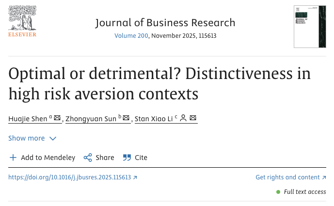 助理教授沈华杰与香港城市大学Stan Xiao Li教授、Zhongyuan Sun博士生在最优区分战略领域研究取得新进展,研究成果《Optimal or detrimental? Distinctiveness in high risk aversion contexts》在管理学高水平期刊《Journal of Business Research》网络首发。av片