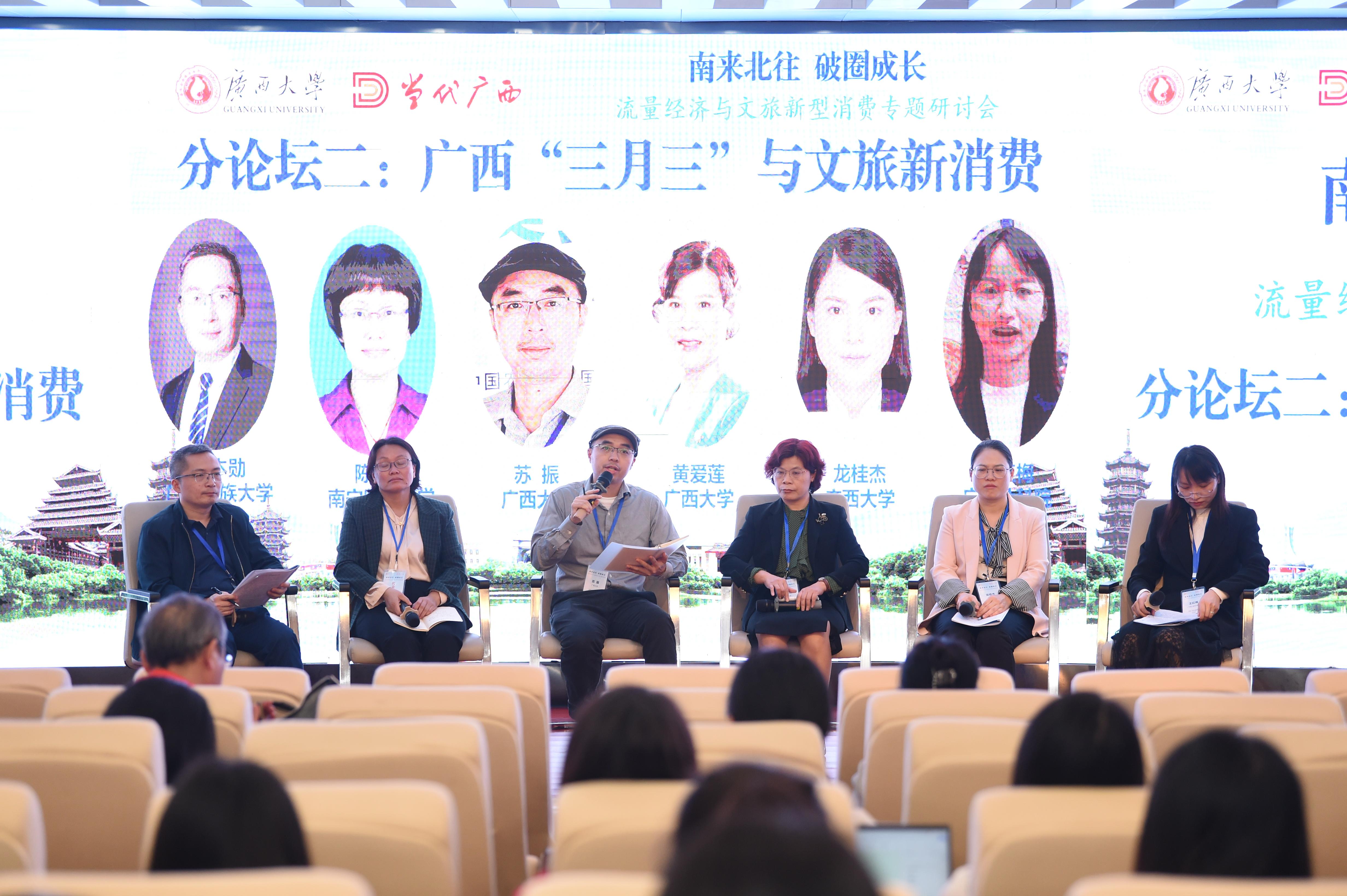 副院长刘民坤教授、胡明明副教授分别围绕“新质生产力视域下文旅新型消费解构与创新重构”“文旅破圈与结盟”“尔滨冰雪热‘冷思考’”“破解‘流量经济’密码”“网红城市旅游需求大数据分析”等方面分别作主题发言。在分论坛研讨环节,与会专家代表分别对网红城市与流量经济、广西“三月三”与文旅新消费开展热烈而深入的交流与讨论。